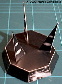 I found an interesting article on the german website www.orionspace.de about modeling the ORION, and so I decided to make a cardboard-model from her so that not only I can have my personal ORION, but other fans too. The model does not have too many parts, but it is a bit difficult to build here and there and some experience in paper-modeling is not too bad. Take your time, and the result will be a nice little model of this classic spaceship. A little word to the scale: Depending on which source about the dimensions of the „Original-ORION" you will believe the scale of the finished model is either approximately 1:500 or 1:1000 (sometimes the diameter of the ship is given with 70 meters, sometimes with 150.). Interesting in this connection is a statement of a FX-technican who worked at the series: „Forget the given dimensions. Important was only the visual effect to the viewer." That says all...Instructions and a couple of pictures are involved in the sheets, so it should be not a great problem to build your own ORION. Click here to download the file. (Acrobat PDF format) Important copyright notice: No commercial interests are connected with this model. The files or possible prints of them are only allowed to be given away for personal uses only without any payment. Prints are only allowed to be made for personal use only. Selling, renting or any other commercial use is strictly forbidden. All copyrights of the series „Raumpatrouille" and all connected terms and designs are in the hand of BAVARIA. |