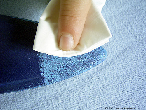 Step 5: ... and gently wipe over the colored area. Make sure to use a clean part of the paper as often as possible, otherwise you will just smear the color back and forth. The pastel color on the raised panels will vanish very easily while it will stay in the „veins". If you wipe it out of the one or other vein simply paint it again with the pencil and wipe it off a second time. There is no limit to these steps; you can do them as often as you like. |