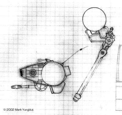 FASA redesigned the robot to be a "light mech" battlemech. This meant that it was fast, lightly armored and primarily used for recon missions. In the early 1980's, a Japanese company called Nitto made a model of the "Ostall" as depicted in the anime. I decided to rebuild this mech depicting the "beefier" version from FASA. I began this project by doing a set of "sketches". I did not bother to create a full-fledged set of plans showing all the views, as this is not required for the techniques I used to make this model. All that I needed was detailed side view and a top drawings, to scale. These were done using a very fine (.03mm) mechanical pencil and a ruler, on graph paper laid out in 1mm squares. Once the initial drawing was done, I made 15 or so xerox copies to be used in the building process. Just a side note here: I prefer to work using a metric scale, as it seriously eases the math needed to lay out the parts in sheet form. |