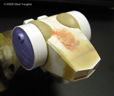 With the basic construction completed, it was time to start with the little details and finish filling the seams that had not been fixed. I built the main gun out of brass tubing, and the tip came from Bic lighter. The dome for the "chin" was made from a Plastruct clear dome. And a slot was cut to accommodate the gun tube. At this point, the entire model was undercoated with Krylon light gray sandable primer. This allowed me to see if there were any seams or flaws that had not been caught in the second pass. I also began to scribe the limited amount of seam lines that were needed on the main body. The other thing that I did at this time was to start adding some if the thin plating that was needed to the roof of the main body, and on the feet.