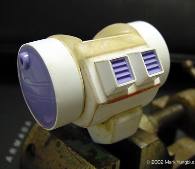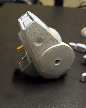 Image: This photo shows the main body from the rear. Note that the small angled section where the top meets the back has been covered with epoxy putty and reshaped. This was done because one side of the angled section ended up drying in place at a lower angle relative to the plane of the top than the other. The putty was used to compensate for this defect. Image: Here we see that the "half domes" have been roughed in to finished off the hips. This was done in epoxy putty and smoothed with a ¼" soft, flat brush. Once it had set, I needed a total of 20 minutes to finish out by wet sanding. These views show the housings for the visible heat sinks in place on the master. ^ RearImage: From the front |
