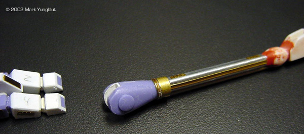 The mounting brackets for the shoulders were made from rectangular brass tubing. And one end was beveled and curved to fit the contour of the semi-domes on the shoulders. Once the brackets were cemented into place (using 5 minute epoxy) and cured, I mounted the shoulder piece in a vise and sanded the outside surface of the bracket to a proper angle. The angle needed to be such that the missile launcher would seat parallel to the plane of the leg. I then filled the hollow space of the rectangular tubing with epoxy putty. This allowed me to drill a hole to accept mounting pins for the pins that were installed on the launcher unit. |