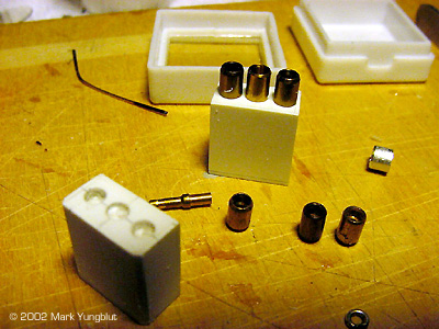 Image: Here we see the scribing done to one of the sides of the main body ^ The rough gun and turretThese shots show the building of the missile launchers. Image: Roughing out the box by wet sanding Image: Launcher tubes were cut from brass tubing Image: The nearly complete assemblies |