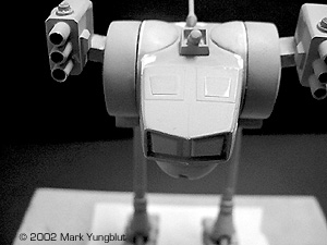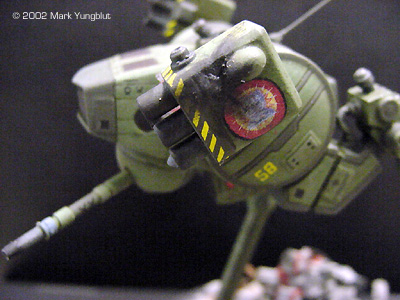 Once both legs were roughed out, I started the finished shaping and filling of the knee joint and the shoulder areas. I built the shoulders of the Locust using two existing semi-domes and wrapping several layers strip styrene around a piece of metal tubing to make the tube flush with the edge of the semi-dome. The lower sections of the shoulders were built using the same laminating technique as with the knee joint. The lower portions of the legs were detailed with etched brass strips and a piece of brass wire. The ankle joint was created using several pieces of brass tubing and two existing pieces out of the scrap bin. The feet were built using smooth sheet styrene and sections cut from a "corrugated" sheet from Evergreen plastics. The corrugated pieces where used to simulate a tread pattern on the bottom of the "toes". All the seams were filled and the edges beveled as per the original art from FASA. |