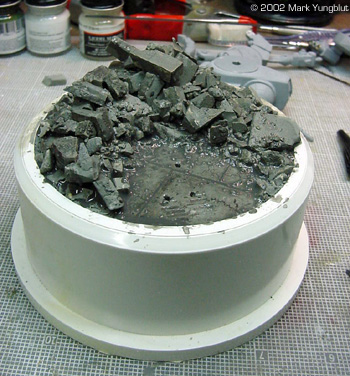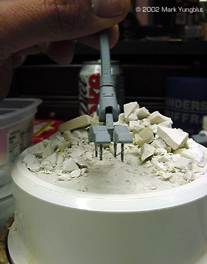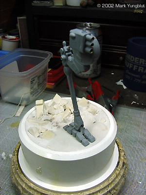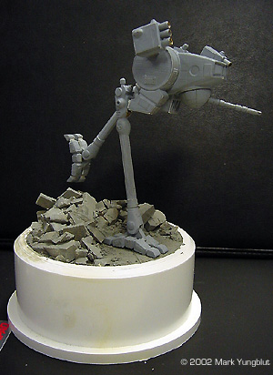 Painting and Mounting the Model on a Base I decided to build the base for the model before starting the paint job on the mech. I started by purchasing a PVC plumbing bushing, as the main part of the base. This would act to elevate the model a few inches, and the bushing would be mounted on a marble vase base. The first step was to create a dam and seal the hole that is part of the bushing. I did this by cutting a circle in .04 plastic. This was set down against the lip that is on the inside of the bushing. I then glued it in with a liberal amount of 5 min epoxy. This acted as a seal to prevent any plaster from leaking when it was poured. What I had in mind for the base was to have a city type rubble scene. I gathered some rubble that I created by buying a Woodland Scenics retaining wall and cutting it up. I placed some of the rubble that would be the bottom layer in the well created by the dam. I then poured fairly thin plaster of paris in the well and let it set up. Before the plaster was completely hard, I took one of the feet and pressed it slightly into the surface. This would aid in making the foot look as though it was in the scene as apposed to just off the surface. I let the plaster dry thoroughly, and then added additional rubble. I also scribed some expansion joints into the flat area.The next step was to put mounting pins in the foot that will touch the ground, and drilled corresponding holes in the base. To add additional strength, I added a piano wire main pin that went down the middle if the foot and up into the leg. This allowed me to make the mech removable from the foot for transporting it to shows. Once this work was done, it was time to paint the plaster base and rubble. I used Floquil concrete as a base coat, and thinned it 20% to make it more of a stain. This allowed the paint to penetrate further down into the plaster. When that was dry, I gave the entire rubble area an oil wash of Payne's gray oil mixed with a little black and burnt umber. The next day, I dry brushed progressively lighter shades of the concrete until I was happy with the shading and contrast. At this point, I masked off the rubble area, and spray-painted the rest of the base with Krylon flat black. I was then ready to finish the mech. |