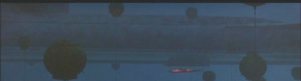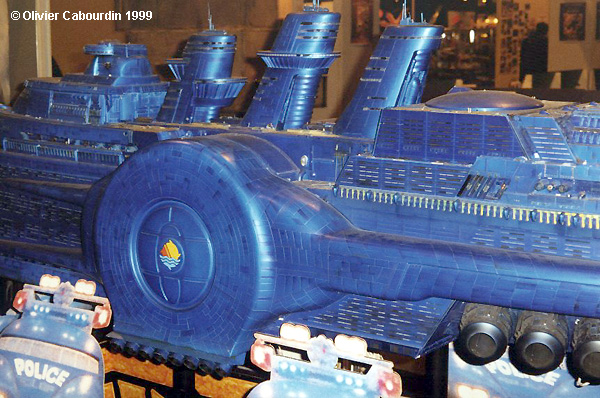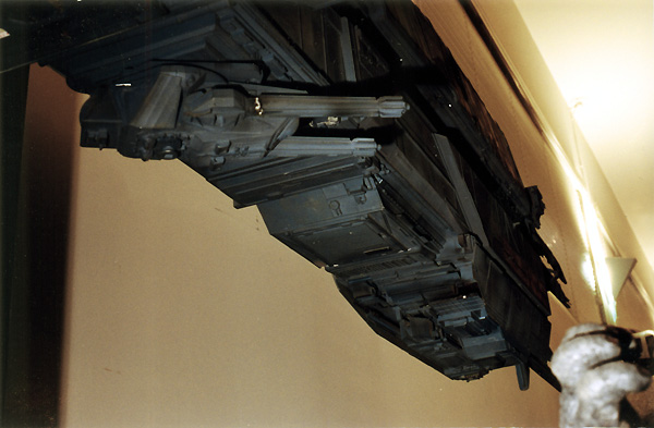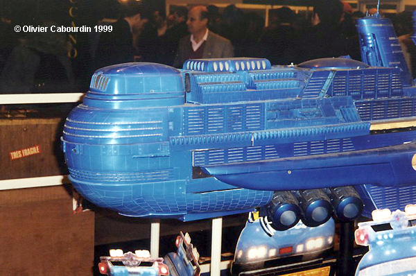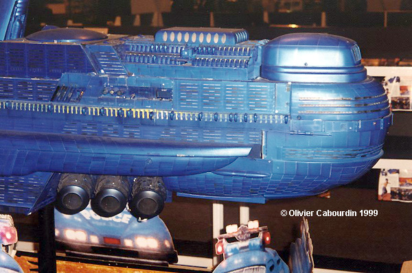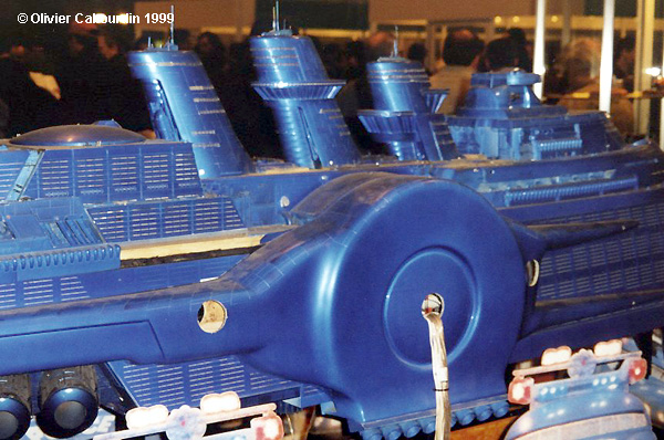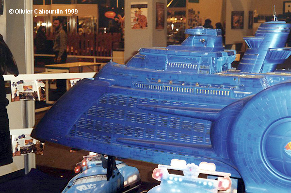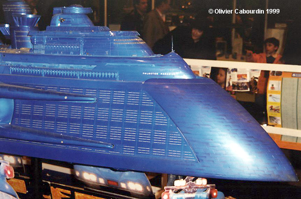 5th Element. 1997's big-budget epic told a tale of Good-vs-Evil in the not too distant future. Even though it boasted state-of-the-art effects, cool hardware and a couple of big name actors, it was not a favorite of critics or movie goers. The Fhlosten Paradise studio model, shown here, was seen at the "Salon de la maquette" (model show) in Paris, in April 98. It is a 2+ meter long model painted in metallized royal blue with shade of dark blue for the panelling effect. Only the left side is completely detailed, including the name of the liner ( written back to front, which unfortunately cannot be seen in these photos). The right side, less detailed, displays three circular holes. Two are for the support structure while filming and one for the electric wires bringing power to all the interior lights. Photos courtesy of Olivier Cabourdin. |