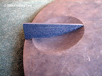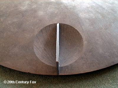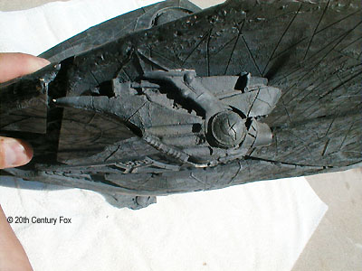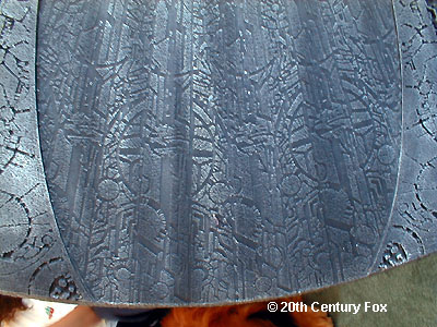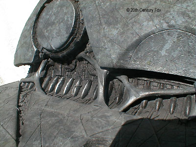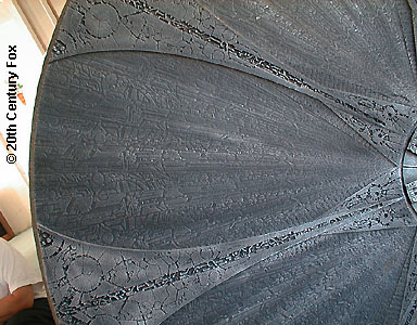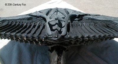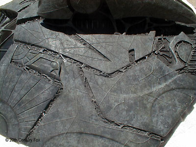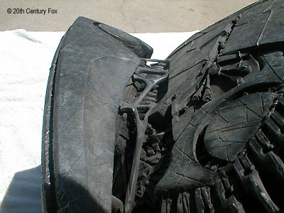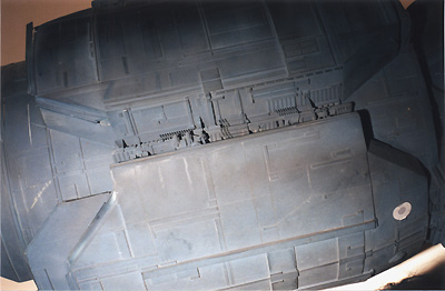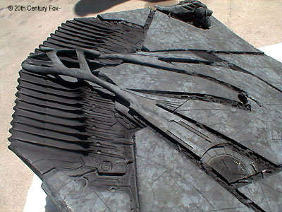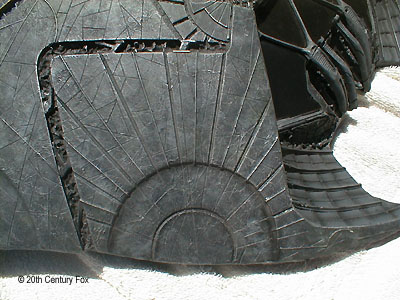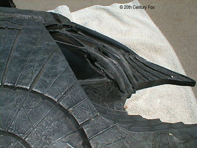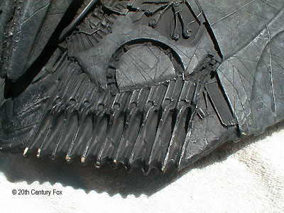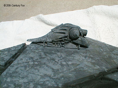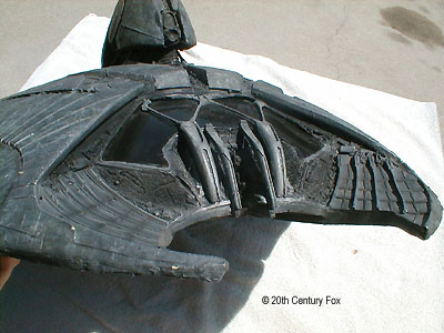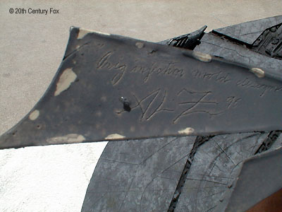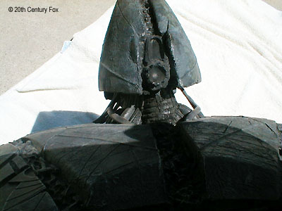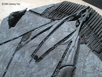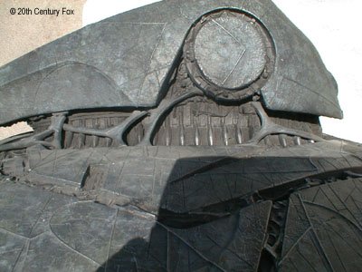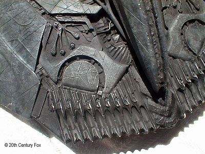 Independence Day The fate of the world depends on . . . Will Smith!? In the proud tradition of sci-fi 'B' movies - bigger, louder, but just as dumb - came this 1997 summer thriller. Enigmatic aliens arrive over Earth, and a after a short pause, lay waste and wreak havoc. Thankfully, the good ol' USA saves the day. In a triumph of special effects, the former-fighter pilot US President leads an aerial armada to kick alien butt, while a goofy scientist cripples the enemy with a computer virus. Ah, well - at least the special effects were good. The mother ships were as large as cities and possessed enough destructive power to destroy a whole city. The fighters are fast and highly maneuverable. The alien weaponry is quite powerful, more than a match for Earth's forces. They are also protected by shields, making them hard to destroy - though they can be destroyed if they run into things, much to Will Smith's delight. Photos from the collection of Mark Dickson. Image 21: Closer look at topside detail. (56 kb)Image 22: Looking straight down the dorsal fin. (26 kb) Image 23: Detailing further forward. (40 kb) Image 24: Under the "dome" on the fin. (38 kb) Image 25: Inboard side view of the attacker's cannon. (32 kb) Image 26: Outboard side view of the weapon. (34 kb) Image 27: Business end of the cannon. (28 kb) Image 28: Cockpit area. (35 kb) Image 29: Rear part of the dorsal fin. (40 kb) Image 30: Top side fuselage detailing (port side) (40 kb) Image 31: Top side fuselage detailing (starboard side). (40 kb) Image 32: "Sunburst" on the starboard side. (43 kb) |