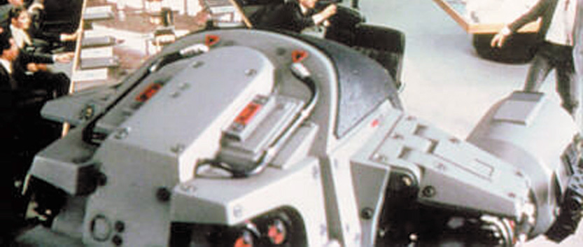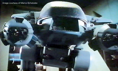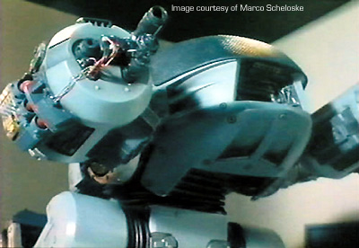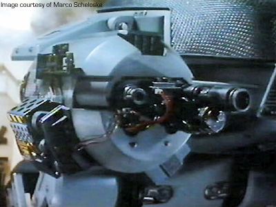 Robocop's ED-209 was the failed attempt by the OCP company to manufacture a law enforcement robot that would be more reliable, and cheaper, than the cyborgs such as Robocop. Unfortunately, the prototype's software had a few bugs ... like killing folks who didn't need it. Screen grabs are courtesy of Marco Scheloske |