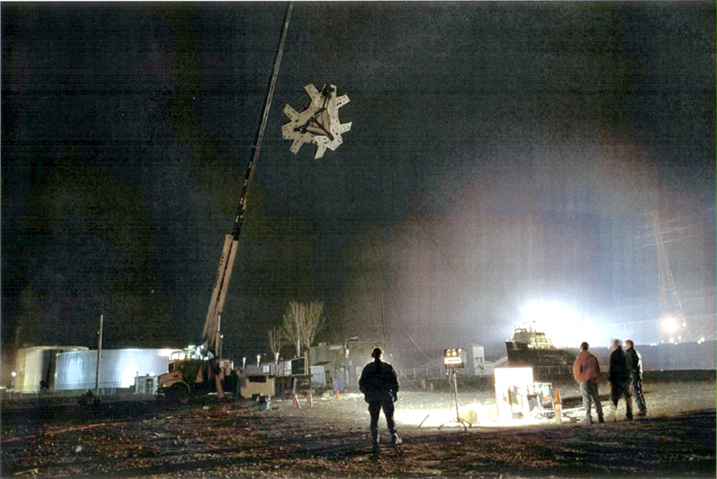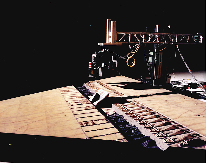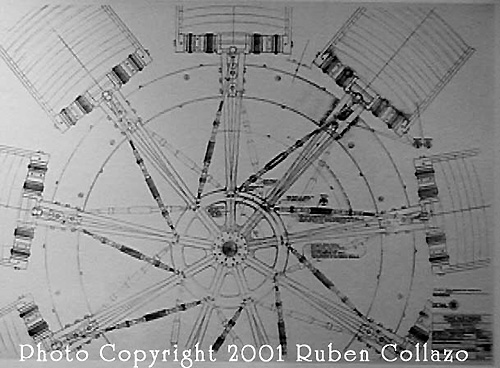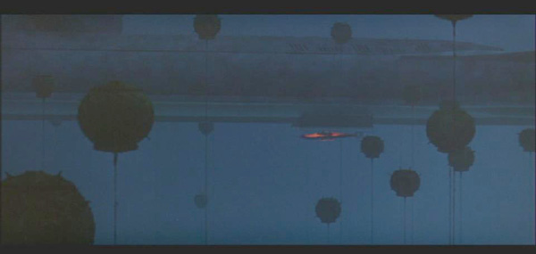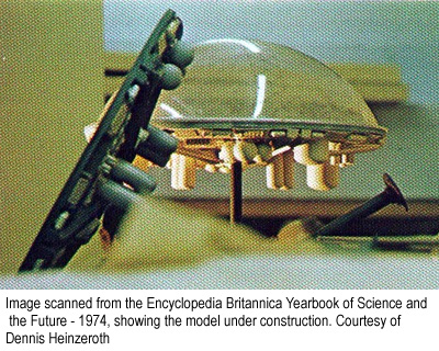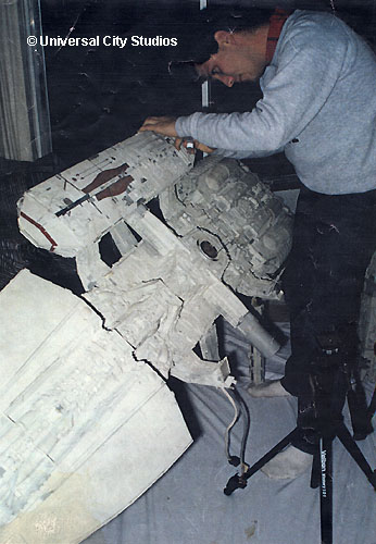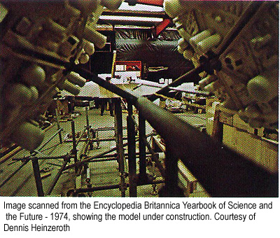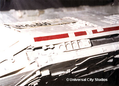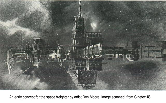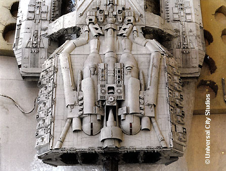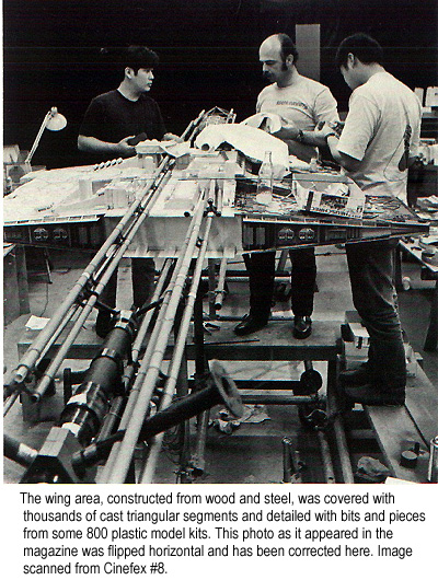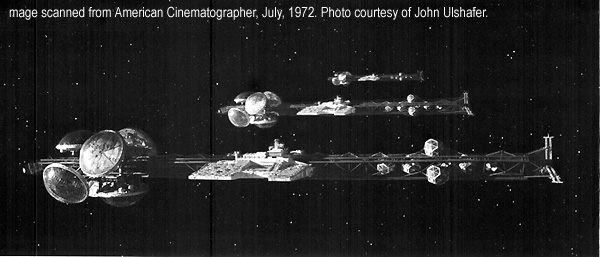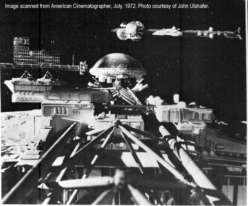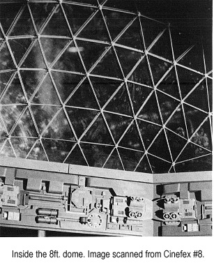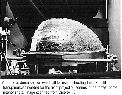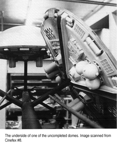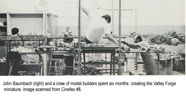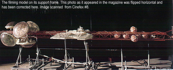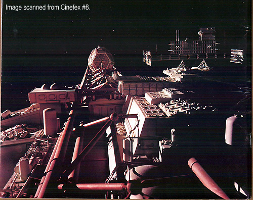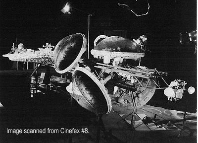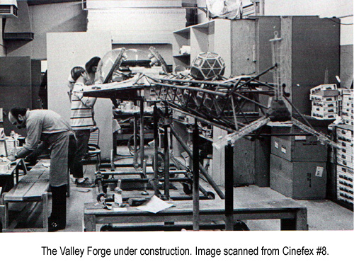 Valley Forge The spacecraft model of the Valley Forge was 26 feet long, and was built under the supervision of John Baumbach. Douglas Trumbull had a definite idea of how the ship should look. "The long superstructure of it was designed after a structure called the Expo Tower at the 1970 World's Fair in Osaka, Japan." Photographs of the tower were turned over to John Dykstra, and along with several others, worked to transform the concept into a space freighter. It was pieced together in three sections on a rolling platform. Two and a half inch steel pipe was bolted together to make the basic armature, and the wing-like midsection was made of wood and steel and covered in plastic. For the remaining structures, metal, wood, and plastic prototypes were constructed , out of which rubber molds were made, cast in epoxy resin, and finally painted. The detailing was taken largely from eight hundred Japanese model kits with the appropriate pieces cut, sanded and glued to the ship. Probably the most tedious job involved in the model's construction was the creation of the six 25-inch forrest domes. Blown plexiglass domes were made and a matrix of holesdrilled in them. Then little standoff insulators for integrated circuits that had holes in the middle were inserted. Copper wire was weaved from one to the next - like sewing - to produce all the grids that make up the geodesic structure.The job required literally months of sitting in front of a drill press and then threading the wire through the matrices of holes. After production of the film was complete, the crew decided to disassemble it and save the pieces. The model had taken six months to build, and was disassembled in the space of an hour and a half. A sad end to one of the most unique and intricately built spacecraft to ever have graced the movie screens. Adapted from an article that appeared in issue #8 of Cinefex - April 1982, written by Pamela Duncan Scans and captures courtesy of Michael J Dentzer, John Ulshafer and Dennis Heinzeroth. |