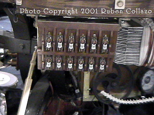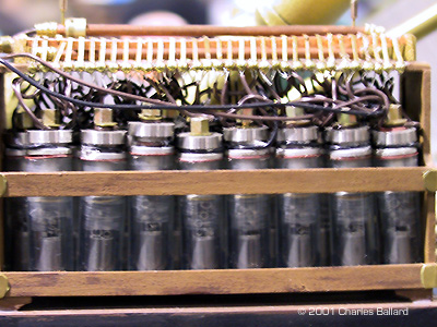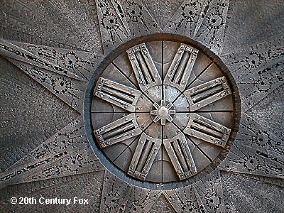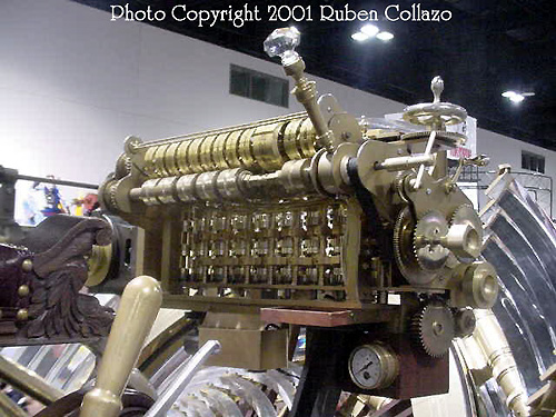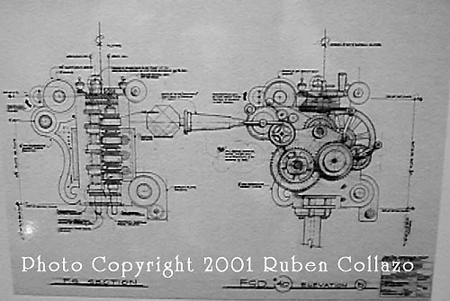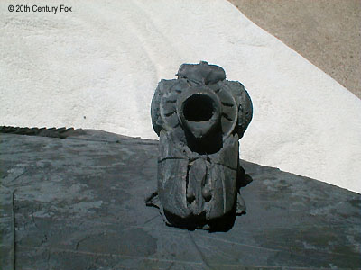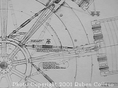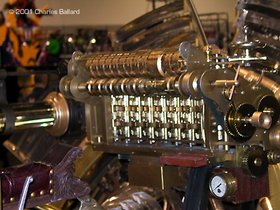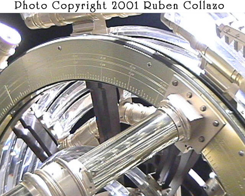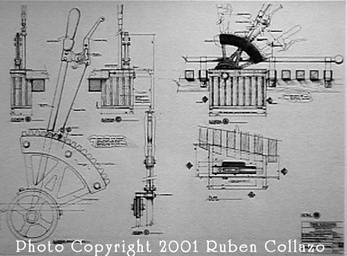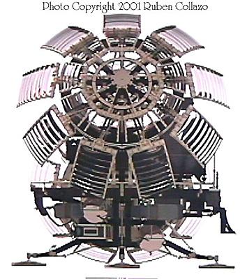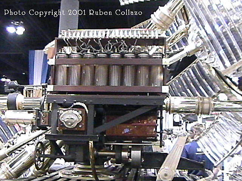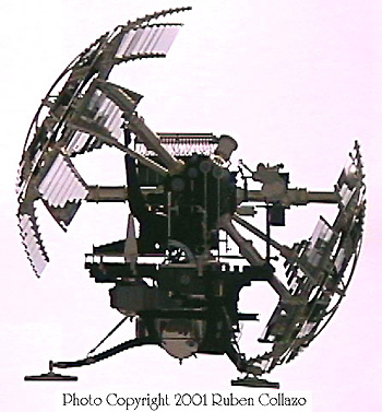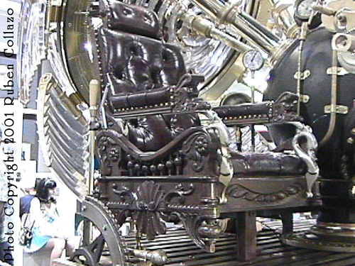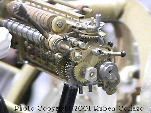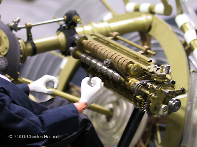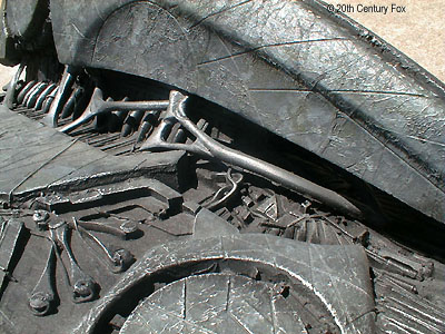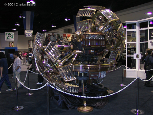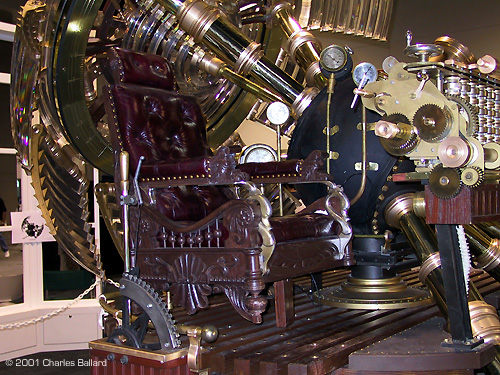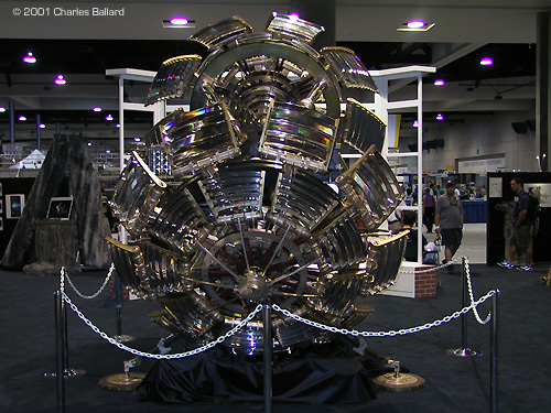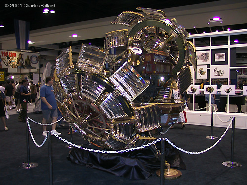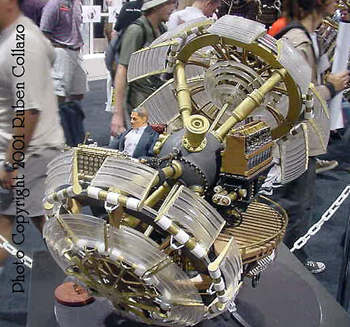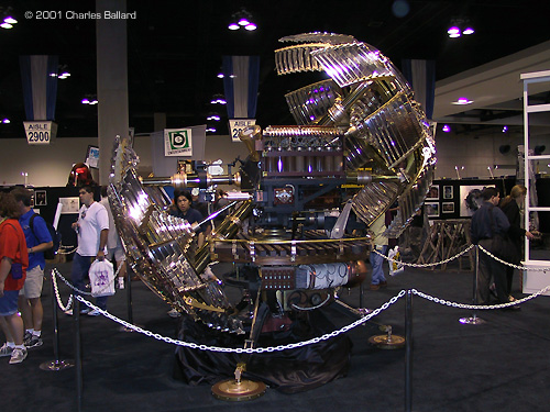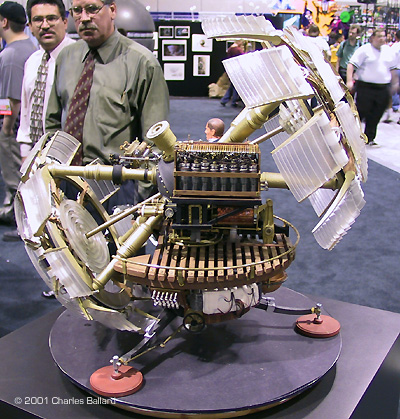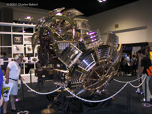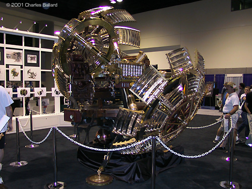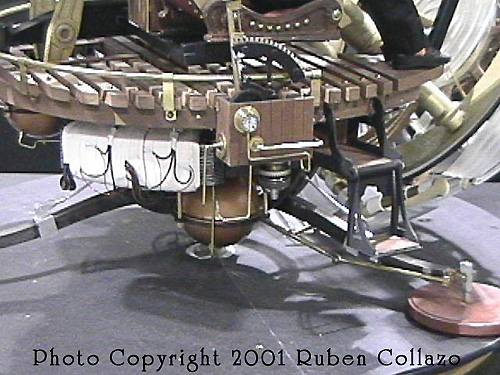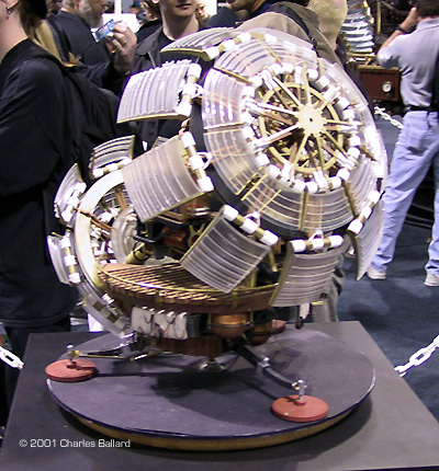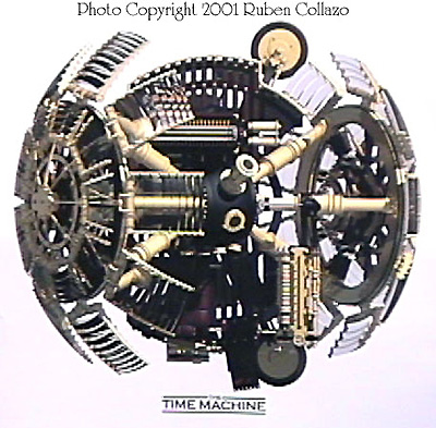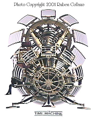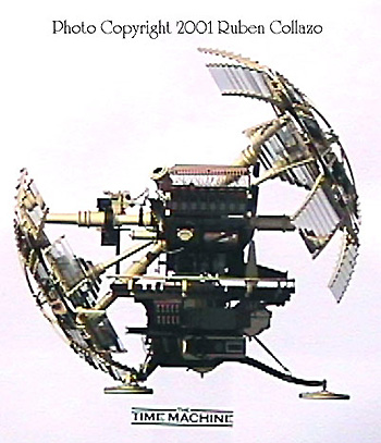 H.G. Wells' classic story is the great grandfather of every time travel story since. The Time Machine tells the story of scientist and inventor Alexander Hartdegen, a man determined to prove time travel is possible. His determination is turned to desperation by a personal tragedy that drives him to attempt to change the past. Testing his theories with a device of his own invention, Hartdegen is flung 800,000 years into the future where he discovers that mankind has devolved into hunter .... and hunted. The Dreamworks SKG/Warner Brothers film for which this prop was made debuts on March 8, 2002 and stars Guy Pearce, Samantha Mumba and Jeremy Irons. These images were taken at the 2001 San Diego ComiCon. Many thanks to T.M. Lindsey for making them available. More images are available at the official movie website. Image 13: Close-up of the end of the control panel. (89 kb) Image 14: Rear view of the machine. (105 kb) Image 15: Fuse panel. (98 kb) Image 16: Boarding ladder. (105 kb) Image 17: Battery, left side. (131 kb) Image 18: 3/4 view of the model. (146 kb) Image 19: Inner face of the wheel. (109 kb) The following images, also from the 2001 ComiCon, are courtesy of Charles K. Ballard and were taken with a Canon PowerShot G1 with a 1 gig IBM Microdrive. Image 20: Filming miniature, rearImage 21: Filmining miniature, left side Image 22: Filming miniature, battery detail Image 23: What are these, towel racks? Image 24: Miniature, controls (right side) Image 25: Controls, this time seen from the front Image 26: Full-sized prop, left side Image 27: Full-sized prop, left/front Image 28: Another look Image 29: Front view Image 30: Right/front Image 31: Right side Image 32: Close-up of the "throne" Image 33: Controls on the 1:1 prop Image 34: "Foot" on the fiull-size prop |