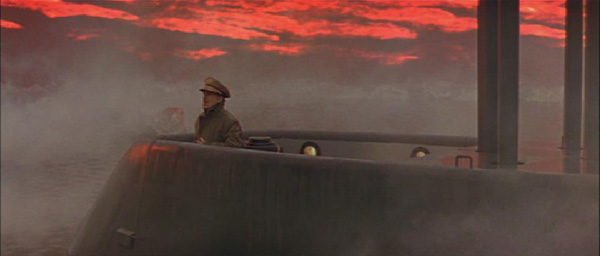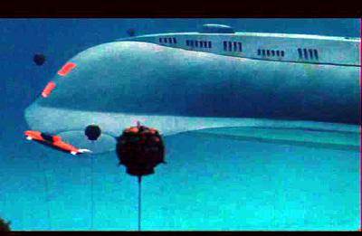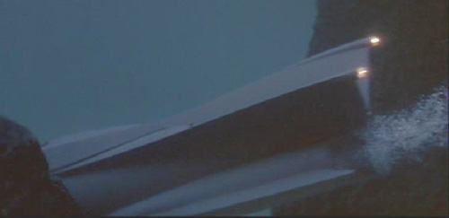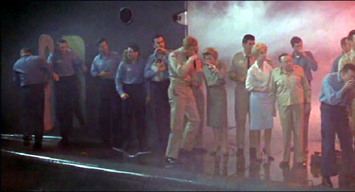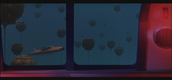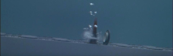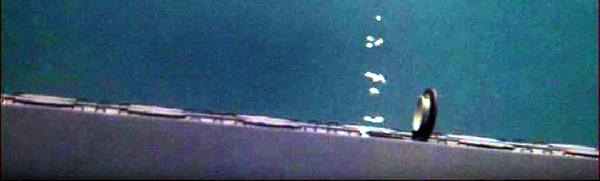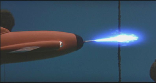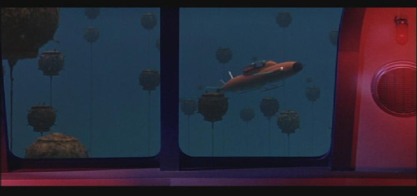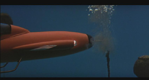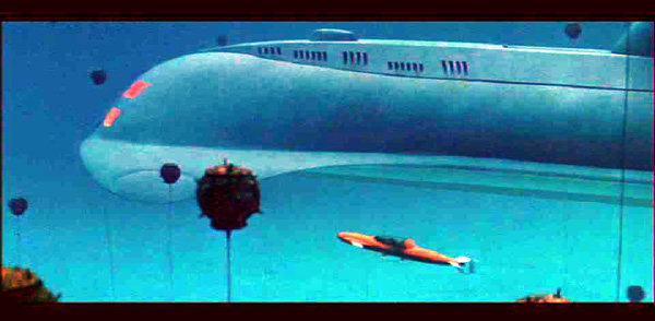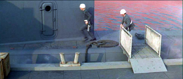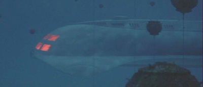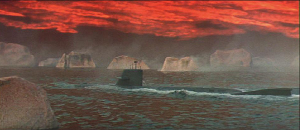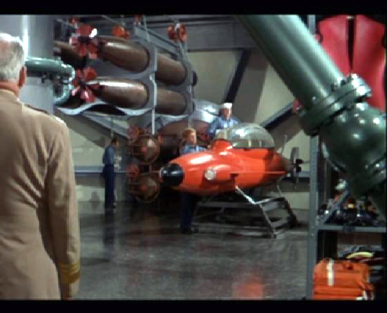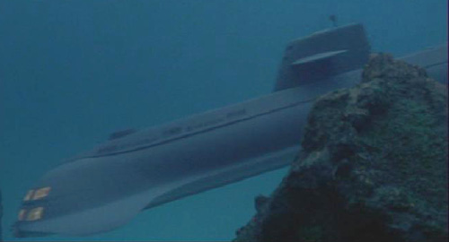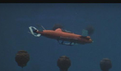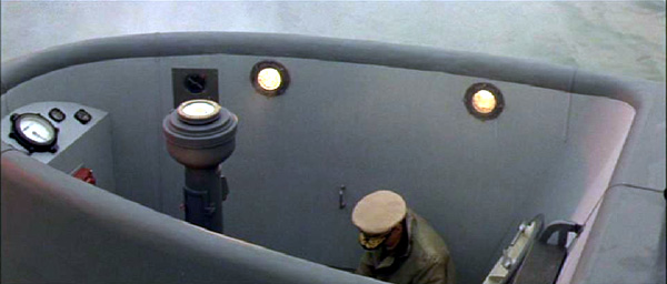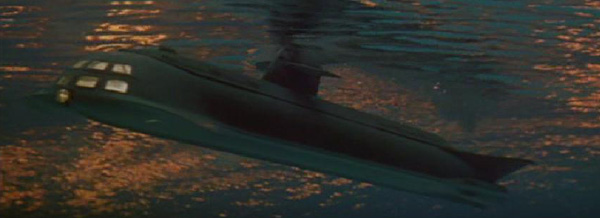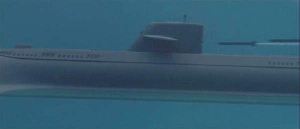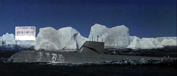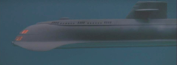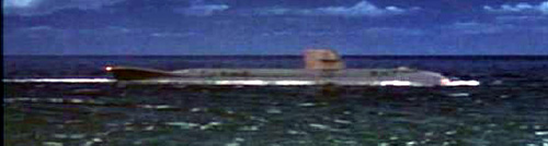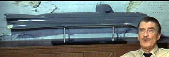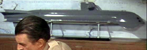 Voyage to the Bottom of the Sea was a classic B-movie that spawned a fairly successful TV series. Irwin Allen's 1961 disaster film had it all: a thin plot, cardboard characters, science so implausible as to be ridiculous, and production values that seem cheaper than they actually were. Yet, somehow, Voyage manages to be an entertaining film, with more action over the course of 2 hours than many shows pack into a full season! There were several filming models plus full size sets, none of which agreed perfectly with each other in details. It's not clear what the actual colors of the models themselves were, other than the topside is darker than the underside. Ford automotive grey and even olive drab have been advanced as possible colors for the filming models; the model in Admiral Nelson's cabin appears to be an intermediate blue over a light grey .... and of course, the full size sets of the missile deck and sail appear to be a medium grey. Thanks to Gordon (IdMonster) for the screen caps. |