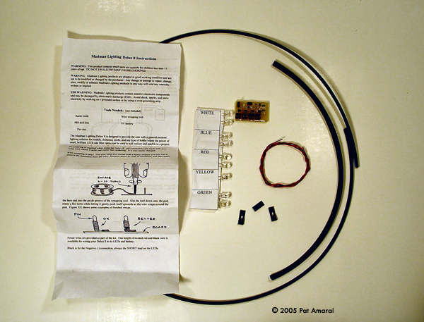 There's just something about a model starship that's been lit up. Adding illumination to a model brings it to life and adds a level of realism that just cannot be achieved in any other way. Still, many modelers resist building lighting systems for their projects. There are myriad reasons for this but I think the number one excuse is lack of know-how. And it's easy to see that. Even though it's a relatively simple operation, lighting can be a little intimidating. There's a lot that must go into the planning of even a simple lighting system for a model. There are all sorts of things to consider. How will it be powered? Do I use LEDs or bulbs? Will I have to use a soldering iron to make my connections? These are just a few of the questions you must ask yourself when you design a lighting system for a modeling project. MadMan Lighting, Inc. of Nashua, NH has just made it a heck of a lot easier. They've released a pre-fabricated kit that answers at least some of the questions listed above. What You Get The Delux 8 Lighting kit comes packed in the same kind of container that computer memory is sometimes packaged in. About 3 feet of jacketed optical fiber and about 10 inches of heat shrink tubing are coiled and attached to the outside of the package with tape. Inside, is a tiny (1¼" x ¾" - 32mm x 19mm) LED Driver Board Board (the circuit card that makes up the heart of the system), 9 5mm, water clear, super bright LEDs of various colors ( 2 red, 2 blue, 2 white, 2 green and 1 yellow), 2 lengths of AWG30 wire-wrap hookup wire (about 2 feet each of black and red), and 3 shorting jumpers. There are some items that are not included but will be needed to make the kit work of you. The items you will need are: |