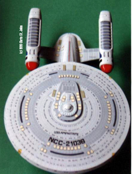 The bottoms were glued into place. The joint is VERY strong, so there's no problem with immediately going to work with completing the nacelles, which I did. The field grills were carefully positioned into the locator holes, and the endcaps were glued into place. When I finally brought the tops down to button the nacelles up, I made certain to get the aft locator pin into its hole first. This insured that I couldn't misalign the forward pins. The nacelles were then immediately wrapped and left to dry. At first, I thought I had screwed up, since the field grills seemed to be set back inside the nacelles too far, then I realized that this was the intended design and breathed a sigh of relief at not having to crack open the units. The nacelles dried rather fast, and I was soon able to affix the decals. I found many of them to be a little redundant, and since this was neither Enterprise nor Yamaguchi, I only used some of them—specifically, the nacelle detail ones, the secondary hull spine stripe, and the 4 small "UNITED FEDERATION OF PLANETS" that were to go on the nacelle ends under the hull number (which I had to cut apart from the rest of the decals intended for that area). I didn't want to have to cut out the words "STARSHIP U.S.S. ENTERPRISE" from the hull pennants included—I've done it before and it's no fun—so going on the "it's been refit" concept, I used 2 of the newer hull pennants left over from an old Sovereign kit, cut them to fit, and applied them in place. The final touch was to ink on the name and hull number to the dorsal and ventral saucer. Once done, the saucer was finally glued onto the secondary hull, and the entire assembly was left sitting upside-down with a weight on it overnight. When I awoke the next morning, the seal has set, but there was a small gap at the back of the saucer/neck joint. A little putty, a little touchup paint, and she was finally done. She is USS Amphitrite, NCC-21036, named after the Nereid who was Poseidon's wife and the goddess of the sea. Except for the few annoyances, this kit wasn't so bad to build. The accuracy was better than usual, the ease-of-building has become IMMENSELY better, and the kit offers a nice amount of possibilities to it. All in all, well worth the $23.31 I paid for her. |