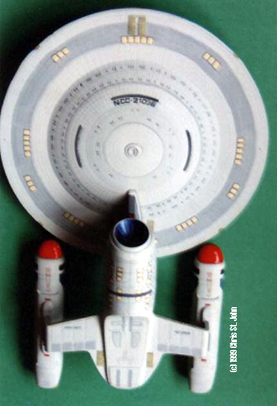 Painting—Hull Basecoat Once again, AMT's paint guide is less than optimal. The basecoat they called for was 80% FS 37875 Flat White, 20% FS 36495 Light Grey; the 2-tone colors were then similar percentages of the white and FS 35044 Insignia Blue. Needless to say, I was unimpressed. I decided to make my basecoat pure Light Grey. I should note at this point that I use the Testors Model Master paints, and the names of colors reflect that. Where possible, I'll give the FS number as well. The parts held the paint well, as is normal for AMT's kits. I found that the saucer was easier to coat when I brushed radially (towards the outer rim) than in large concentric circles, and the secondary hull coat worked better when brushed along the bow-to-stern longitudinal axis. Also, since I had already assembled the secondary hull prior to painting, I mashed a toilet paper tube into the front hole where the deflector dish would go to hold it while painting. While I waited for the basecoat to dry, I went to work on the nacelle endcaps and field grills. I've found that most starship modelers keep certain colors in their inventory for specific items, and I am no exception. The endcaps were done in Guards Red, as was the impulse exhaust, and the grills in French Blue, both sets being coated inside and out to give a healthier "glow" to them. As I set them aside, I painted the navigational deflector in a deep rich metallic blue nail polish that I bought expressly for this purpose. A word about nail polish—many times, I've looked for a metallic look that normal model paints are unable to afford me. Then a friend told me about looking in the nail polish aisle. Since then, I've almost always used one of 2 bottles of polish for navigational deflectors. I like the look, and most go from wet to set in 60 seconds or so. Indeed, this one did so, and I painted the rim in the Light Grey, while doing the "strakes" on the inside of the dish in Rust. When the basecoat was dry, I set upon doing the 2-toning. |