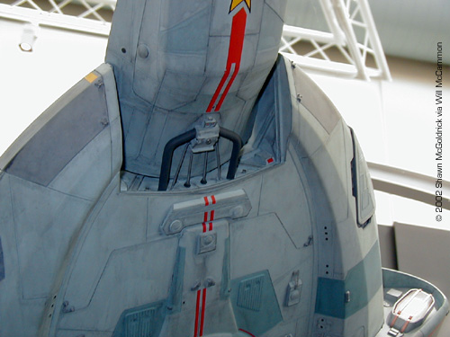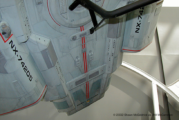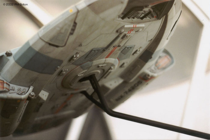 The USS Defiant and her sister ships were originally developed as small, agile and powerfully armed warships to meet the Borg threat. When the Borg threat receded, and design flaws discovered during the lead ship's shakedown cruise, the project was suspended (it would later be restarted with the outbreak of the Dominion War). The USS Defiant was assigned to Deep Space 9 in 2371, in part to meet the Jem'Hadar threat. First seen in DS9's "The Search", the Defiant has also appeared in "Star Trek: First Contact". It was designed by concept artist Jim Martin under the direction of Herman Zimmerman; the studio model was built by Tony Meininger with Gary Hutzel. Photos are courtesy of Phil Bolton and Will McCammon (taken by Shawn McGoldrick). Both sets were taken at the Museum Of Flight in Seattle, WA . The filming miniatures of the USS Defiant and Deep Space Nine were included in the 2001: Building for Space Travel exhibit. The Defiant was displayed fairly high up and in a corner, which made getting pictures lined up a bit difficult. There are some good close-ups of detail areas that I'd never seen pictures of on the web, so the effort was worth it - thanks to my pal Shawn. There are a lot of greeblie details that I'd never noticed before. The model itself is smaller than I'd expected; roughly 2-3 feet long.--- Will McCammon |