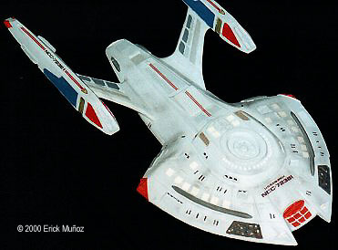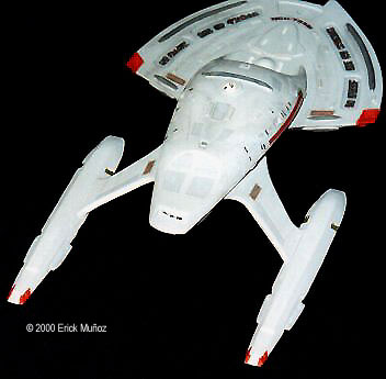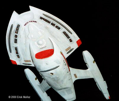 Later that year, when I saw that Starcraft Models had the Equinox for sale, I jumped at the opportunity. I didn't know how they managed to get a model out since all the previous information on it was sketchy at best. But they seemed to have the schematics somehow and managed to make a nice little model out of them. It's a one piece resin model that comes with a base, but no rod to make a stand (typical of Starcraft Models.) It's only about 6 inches long, but it's nicely detailed and in the accepted 1/1400 scale for Star Trek ships. Inspection/Preparation The ship (no point in calling it a kit, it's just one part) was in the usual Starcraft packaging: a box that was so full of foam peanuts that it barely closed. Once I pulled the model out of the box, I was impressed with what I saw. I was expecting something akin to the Akira- class model that had wobbly engraved lines and crooked windows and an iffy casting job. But they have seemed to improve over time and managed to make straight lines, better windows, and a much improved casting job. I was curious about the details since there were no official drawings of the ships out yet, but they seemed to be pretty close to what's seen on screen. There are a few problems with the grid lines and the shape of the hull here and there, but those are minor points. The model is actually quite accurate to the official schematics. The molding was also very good. There were only a couple of spots to either sand or fill, and it only took about 15 minutes to get it ready. One of the nacelles was slightly crooked though. The pylon isn't too thick, so it may have lost its shape during shipping. But a few minutes under the hot water, a small bend and some cold water and I was set. All I needed was to clean the surface to remove any mold-release agent and I would be ready to paint it. There were a couple of couple small problems I did notice, however. One of the top sensor pallets had several small bumps all over it. And some of the windows seemed to be a little shallow. There were also some areas where the resin had many small bubbles at the surface. But these were minor problems that didn't seem to detract from the overall appearance. |