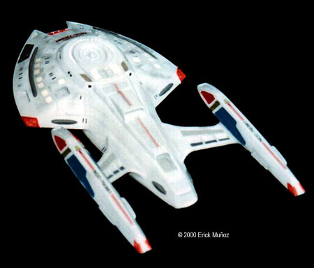 Last year's Star Trek: Voyager's® cliff-hanger introduced us to the new Nova-class ship, the U.S.S. Equinox. Designed specifically for the show, the Equinox is a pure CGI model that has clear design characteristics reminiscent of Voyager and the Enterprise-E. |