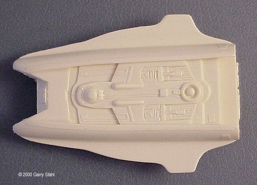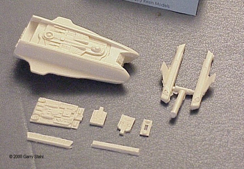 The kit comes packed in a poly bag, and wrapped in bubble wrap for shipping. Nothing was broken. The model consists of a main hull, various detailing parts to be glued directly to the hull and the pylon-nacelle assemblies. There is a large cut off burr on the hull. The nacelles, which are shipped on their own sprue, have a good deal of light flash, and a very slight mold line. The detail pieces exhibit some minimal flash and no mold lines. All parts are free of pits or visible bubbles on my kit. All detail is sharp and clear. It holds up to inspection under a magnifier. Areas without details are smooth and regular. As far as accuracy goes .... it looks like the Jenolin. I never got closer than a look at the TV screen and have never seen any model shots of the studio model. I am happy with it. Whether it has areas that would offend the rabid accuracy hound I do not know. The instructions are spare but lucid. Paint selection is indeterminate (light grey, dark grey, etc.) and no federal standard numbers used. No decals are included. I am happy with the kit. It looks like a "fall together" build. I anticipate problems only in the area of getting the pylons on straight and level. It can't be clamped, so I'll use super glue and accelerator (three hands time). |