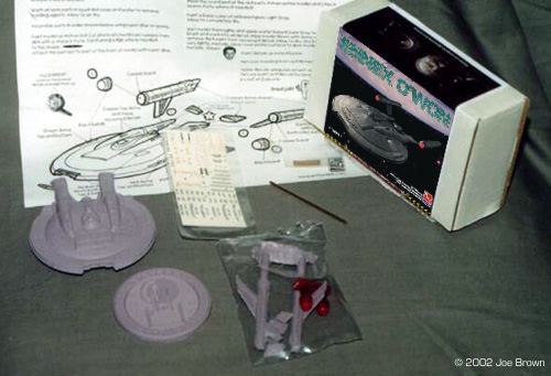 The box itself is very sturdy, and survived a weekend of being lugged around an IPMS event in my backpack. Opening the box showed the warp nacelles, the two impulse engine exhausts, and their connector, all in a sealed bag that also held the Bussard nacelle caps. The main hull/saucer section and the 'shoulder-patch' resin base were loose, as was the brass rod to mount the ship upon. The photo etch deflector dish is bagged separately, and taped to the lid of the box. A full size, double sided instruction sheet is included, along with a decal sheet. The lavender shaded resin is a bit of a color surprise, but it won't matter at all once it's primed and painted. Like many resin Starfleet model releases, the Ennex O'Won is in 1/1400 scale, allowing you to show it off with most of the ERTL Star Trek armada in a consistent scale. What You GetInside the sturdy box are seven lavender resin pieces (which make up the ship and the base), two clear resin pieces tinted red (Bussard scoops), decals and instructions. The resin bits are almost entirely clear of defects (duh, it's a brand new mold!), though I did find a few tiny, tiny bubbles hiding near the aft section of the hull, on the 4 small 'joiner' pieces that fit under the impulse engines, and a barely noticeable mold seam along the aft hull booms. The red Bussard scoops are almost water clear, and free of bubbles. The base is incredibly well done for this model, and could be used 'as is'. I'll mount it on a painted wood display stand, and then the completed ship on top of that. Detail is wonderfully crisp and clean throughout and consists of engraved windows and panel lines, and a surprising number of raised hull panel sections. The only flaws I could find were that several of the windows along the aft edge of the primary hull's rim are a hair crooked. However, it's really not apparent at all unless you put your eye within five inches from the model, so I have no issues with that. |