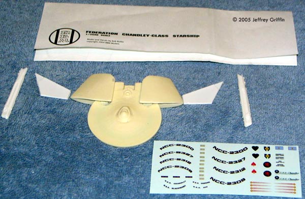 FASA also released a lead-miniature of the ship design not long afterward. Ever since that initial recognition manual release, I've wanted one of these. Now, thanks to RBM Models I've got one in 1/2500 scale! It's a rather unique design, being more of a border ship. The "shoulders" include Star Fleet Marine barracks and training areas. According to the FASA manuals, 250 Marines are assigned to Chandley-class frigates, making it one of the most unique designs for the Federation. All the more reason for me to like it - it's not your standard Star Fleet ship. What You Get The kit includes five pieces, total: the main hull, two pylons and two nacelles. The kit has also recently been remolded so that you get clean, crisp castings. The new molds have fixed a couple of areas in the kit that were flawd, mostly right around the "shoulders" and where they mate up with the saucer. There were some voids there that required filling on my first kits, but no more with this new casting! The castings seem much crisper than on the first kit I purchased - not that they were bad before. |