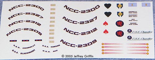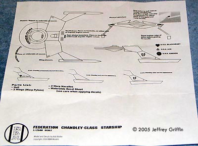 Also included is a basic instruction sheet for placement of parts and decals. It's a one-sheet affair and gives you the instruction you need to assemble the kit, including alternate decal arrangements. The decal sheet is LaserJet printed and fairly comprehensive for such "minimalist" designed ships. You get a choice of four names - Chandley, Hanson, Blackheart and Ace. The decals include shuttlebay doors, phaser emplacements and full markings for all four ships, to include special markings for the lower portion of the pylons that give each ship a very individual look. Assembly and Finish I've purchased a total of two of these and have one already built up, tho not yet finished. It builds up nicely, tho you have to be careful about pylon and nacelle alignment. It's not easy to put it together if you're not fairly familar w/the design. My only real nit-to-pick is that the pylon attachment points are somewhat "hollow", which strikes me as wrong. As such, I filled those areas in and "squared them out" somewhat with some Tamiya Modeling Putty. It looks much better that way to me and it looks great in flat white, so far. Conclusions This model looks like it's going to be an awesome addition to my Movie Era fleet. I'll have to purchase a third so that I could have all three ships from the decal sheet in my fleet. I highly recommend it to any 1/2500 Star Trek modeler and think we should all be thankful that RBM Models only charges $10 for each of these, shipped! Many thanks to Griff's wallet for providing the review samples. Manufacturers and retailers, interested in getting your wares reviewed and publicized on a site averaging 3500+ readers a day? Contact us! |