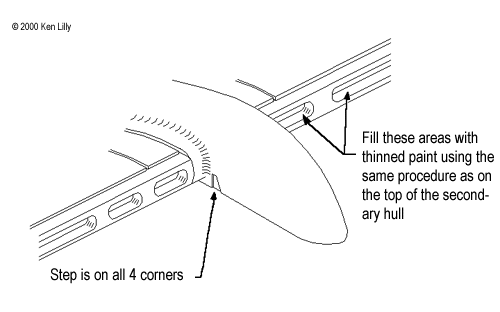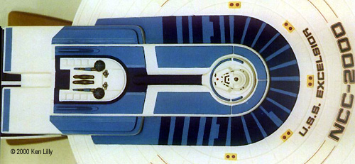 Step 6: Wait until after painting and decaling. PaintingI decided not to paint my kit with an Aztec pattern, since there is a lot of complex masking on this kit anyway, and I actually wanted to finish a kit for a change. The paint guide in the kit is good, but it does leave several important details off. First, the major problem is the listing of gull gray instead of dark blue. The gull gray causes problems with painting as well, since it is printed light and light blue is printed dark, it is very easy to mix these 2 colors up, especially around the top of the primary hull. Also, the triangular areas on the side of the impulse engines are not shown on the paint guide, but are shown on the box. I began by applying several light coats of Testor flat white enamel to all subassemblies (except for the clear parts of course). This was allowed to dry for a couple of days since a lot of masking was going on top of it. I used Testor flat sky blue for the light blue areas and Testor Acryl Cobalt Blue for the dark blue areas. I masked off and painted the primary hull in stages since there is so much to be masked, and I didn't want to leave the tape on longer than I had to. The ring on the bottom of the hull proved rather difficult to mask off, and I tried several techniques before finding one that worked. I tried cutting the tape using the lip as a guide, but it is too hard to get a smooth edge on the tape. Next I tried 3M Fine-Line plastic tape, but it would not conform to the curve without buckling. Finally I ended up cutting masking tape into strips about 1/16" wide, but these strips will not run more than 2-3" without buckling, so it took me nearly an hour to mask both sides of the ring. The top of the hull was masked using masking tape, a ruler, a piece of glass as a cutting surface, several new #11 blades, and a ton of patience. The light blue areas were airbrushed over a period of several evenings, and the dark blue areas were painted by brush and airbrush during one evening. There are really no tricks I used to paint all the detail: just take your time masking and painting. I also masked off and airbrushed the phaser pads, but the thruster areas were hand painted. The other details were picked out by hand using various enamel and acrylic paints. The triangular areas on the sides of the impulse engines were laid out based on the box art, about 1/16" in from the edges is about right. The neck assembly and the ribbed piece under the warp pylon were painted dark blue, and then dry-brushed a with a lightened shade of dark blue to bring out the ribs. The secondary hull was painted in 2 pieces because the blue stripe is at the joint between the top and bottom pieces, and its easier to mask in 2 pieces instead of one. The stripe was rather easy to mask, but the 2 dark blue panels on the bottom were more difficult to mask because of the compound curves. Once again, cutting masking tape into narrow strips was the most time consuming task. The top of the secondary hull was masked and painted in a similar fashion, but the engraved details required special attention. The engraved lines at the warp pylon would have been impossible to mask, so I took some of the paint I had thinned for airbrushing and ran it into the line with a brush. I wasn't concerned about a good paint job, just get enough to cover in there. Then wait about 10-15 minutes, take a cotton swab moistened in rubbing alcohol and rub it perpendicular over the lines, removing the paint without messing up the enamel paint underneath. The same procedure was used to fill in the lines on the tiled area where the spray didn't reach, and on the indentations in the warp pylon. The warp engines were fairly easy to paint except for one part, the blue stripe running around the center bulge. The stripe is supposed to follow the decal stripes, but you can't decal until you've painted. Based on the pictures on the box, I assumed the stripe was as thick as the pylons and was in the in same place. I placed the part on a flat surface, and used a pencil shimmed up to the proper height to make a light line all around, and then masked it, but later on I found out the stripe was too thick. Clear PartsI wanted to paint the clear parts on top of the warp engines and the deflector dish to represent the "glow" as seen on the studio model, so I used Testors Light Gloss Blue and Dark Gloss Blue for this step. And to give an effect of "depth", I painted these parts on the back side. When painting this step, the standard way to airbrush is light to dark, but in this case, you have to paint dark to light. I tried light to dark first, but you really can't see the overspray on clear plastic until it's too late and the overspray of the light blue obscured almost all of the dark blue. So I stripped it off and painted dark to light. I painted the parts by dividing the parts into "thirds", on the warp engines, paint a third of the way in from each edge dark blue, and on the deflector dish, paint a third of the way in all around the edge of the part dark blue. Then go over the whole back with light blue to ensure an even color. The ribbed clear parts of the warp engines were painted Gunship Gray on the outside and then gloss coated. But I should have painted them from the inside to give the same effect of depth as on the tops. I tried a similar procedure on the impulse engines, but they are so small, that it's hard to airbrush them like the warp engines, so I ended up painting them Insignia Red. DecalsI find it easier to decal starships in sub-assemblies, it's easier to handle in sections, and you don't have to worry about handling wet decals when you have to move the ship. I started by airbrushing several coats of Future until I had a nice glossy surface and I let it dry overnight. An important thing to remember when decaling starships is that there is a lot of raised detail for the decals to conform to, so decal solutions are a necessity. I used Micro Set and Micro Sol on the