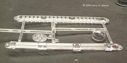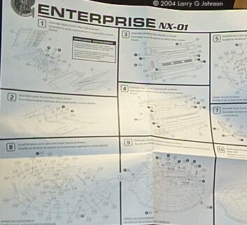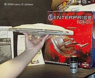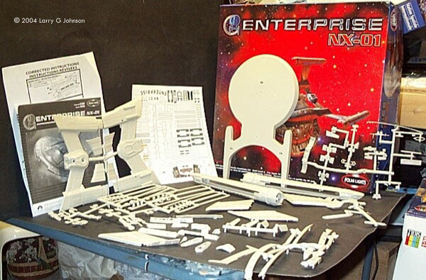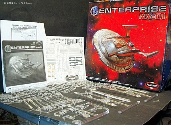 Enterprise has met with mixed reactions by the Star Trek fans. Some hate it for messing up the general Star Trek continuity; some appreciate it as good science fiction in a television world where we see less and less; others say its okay Sci-Fi but not good Trek. The ship itself is met with debate about its technical appearance surpassing what should have been a higher tech level in TOS Trek. Some call it the Akiraprise due to it’s resemblance to the Akira class seen in First Contact. I call it a really big honking, kewl model in 1/350th scale. The Kit This monster is composed of a total of 13 trees - 7 trees of 122 off-white styrene parts and a whopping 152 clear parts on 6 trees. The 4 warp nacelle halves, two saucer halves, and starship shaped base are separate in their own bags. I like to show a picture of all the parts together but it’s not possible with the size of this kit. It took three pictures to show all the parts. The box is the standard tray lid variety with a study bottom, and the parts, and decals, are all in plastic baggies. Mysteriously enough, one of my kit’s bags was opened and many parts were broken off loose, even though the kit was sealed in the shrink-wrap. I don’t know if this is attributable to Polar Lights packing it badly or rough handling in transit. You also get a big fold out instruction sheet, an errata sheet, and large sheet of waterslide decals. At A Glance The plastic is the stuff typical of Polar Lights, kind of thick and a little too soft. Panel lines are engraved and a little deep. They also stop short of the superstructure. Detail is very good otherwise. Except for the depth and shortness of the panel lines, the parts look close enough to the real CG ship for me. Test fitting the saucer halves I can see it has some minor fit problems. It looks like the starboard boom housing on my kit is a little warped. Gluing and taping it in place with the rest of the boom inserted should rectify this. This is, by the way, a "Skill Level 2" glue kit - or so says the box, anyway. Most of the clear parts are window inserts. They fit against the inside of the kit with clear rod fitting into the portholes. With this many windows, the kit begs to be lit and some interior could be scratchbuilt. Perhaps we will see an after market bridge with some 1/350th brass figures. There are also clear inserts for the warp nacelles as well and two part bussard collectors. Polar Lights must also have heard complaints about the quality of their display stands. A model the size of the NX-01 would necessarily warrant a strong stand. A 12" x 6.5" base is provided in the shape of starship and three clear styrene rods support the saucer and the nacelles. |