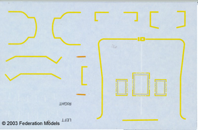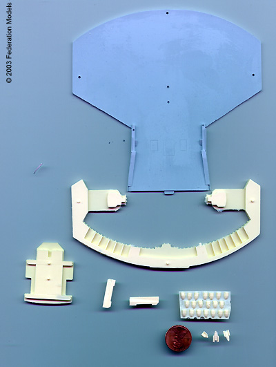 What You Get Federation's latest offering enables you to open up the shuttlebay and actually show off something more than a blank deck. It includes five resin pieces for the deck and individual shuttle "stalls", plus 20 tiny shuttles and 2 "Speedboat" shuttles. Decals provide the deck markings. A comprehensive - if short - instruction sheet rounds out the package. As we've come to expect form this company, the casting is quite good. There were no defects other than a little easily-cleaned flash in my sample. Detail is sharp enough, and certainly adequate for the scale. Note that while the bulk of the shuttles come attached to wafer of resin, they are very easily removed -- so easily, in fact, several were already adrift when I first opened the bag. Decals are ALPS-printed by JTGraphics. They appear adequately opaque, and thin enough to conform to the raised surfaces (though I'd slice them up rather than try to mash down with decal solvent). |