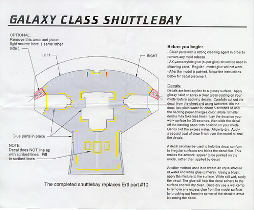 The instructions consist of a placement diagram that doubles as paint guide and decal placement guide, plus generic assembly and decalling tips. They are not clear on where the two small rectangular supports are to be placed, nor what you need to remove (if anything) on the ERTL kit. They do hint at where LEDs may be placed to illuminate the bay, if you so choose. Is it accurate? I don't have a technical manual or blueprint of the deck to say for certain. I will say that it certainly looks the part. Conclusions Federation has produced a simple conversion that should be quite eye-catching when incorporated into your ERTL Enterprise-D. As the pieces replace pieces already in the kit, it looks simple enough to install that I can safely recommend this to anyone with a few models under their belt that wants to give "super-detailing" a try. Many thanks to Federation Modelsfor providing the review sample. Manufacturers and retailers, interested in getting your wares reviewed and publicized on a site averaging 3500+ readers a day? Contact us! |
