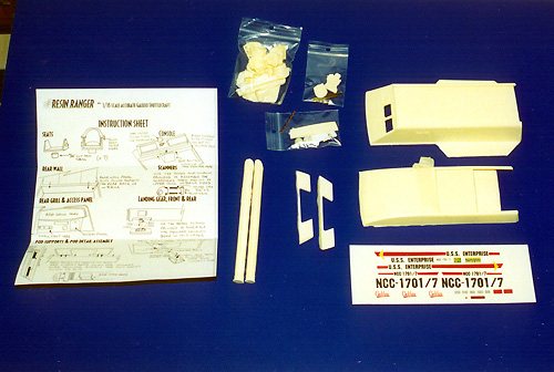 The kit comes in a plastic bag closed tightly with a header card. All the smaller parts are safely enclosed in bags inside the two-piece hull, to help prevent breakage. The original was not overly detailed; the detail molded on the kit appears acceptable. Casting quality is typical for sci-fi garage kits. Most parts are pockmarket with small pits and bubbles, and several have prominent mold seams. Just about every one of the smaller pieces has a rough texture, which will be a challenge to deal with. Both the warp nacelles in my sample are warped, but that should be easily fixed with hot water and patience. Harder to fix will be the prominent mold seam on the parts, the mis-shapen warp "balls", and the grill details on the side. The latter two will almost certainly have to be replaced, in fact. The rear wall on the top half of the hull is curved inward at one corner - a problem with the master, it appears. The instructions are generally adequate, but there are several ambiguous points where good references will be helpful. No painting or marking guide was supplied with this kit. No matter - between the Franz Joseph book and Starfleet Mechanics, there's plenty of references available. Decals are provided for both the interior (consoles) and exterior markings. They appear to be printed with an inkjet on special paper, then overcoated with a carrier film. The bits I tried slid off the paper easily enough, and are not overly thin. Still, I think one would be better off using the exterior decals from the ERTL kit, or the old Webgames sheet for the 18" Enterprise if you can find it. Assembly & Finish Assembly appears straightforward. The biggest chore will be filling in all the bubbles and sanding down excess resin and bumps - and that's just tedious, not hard. Fit of the major parts appears to be fine. Perhaps the biggest challenge will be hiding the seam between top and bottom hull halves - on the inside. There is no seam visible on the TV show; if one elects to cut the door open and use clear window panes (they were shown open and closed at various times in the series), a false wall will need to be built up from 5 thou sheet. That is, of course, only if you can't live with a visible join there (I can). One nice extra is a recess is already provided for Lightsheet on the roof of the cabin. The space between the rear wall and the impulse engines is just big enough to take an LDX-5 driver to power the light. Conclusions Despite it's drawbacks, this kit is a credible first effort and I'm eagerly anticipating their next release (a Type 9 shuttle). If you're not concerned about total accuracy, or have a limited budget, find the ERTL kit. If you want an accurate shuttle, get this one - it will reward effort and patience with a very nice display model. I would recommend this to the intermediate modeler with some experience working with resin.Many thanks to Resin Ranger for providing the review sample. Manufacturers and retailers, interested in getting your wares reviewed and publicized on a site averaging 2000+ readers a day? Contact us! |