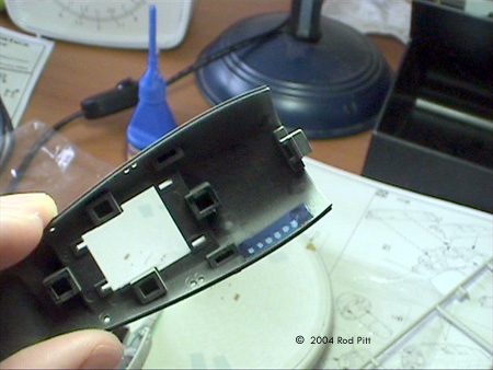Image: The troublesome neck Image: Those big seamlines Image: The nacelle and wiring Image: The secondary hull begins. Note the light assembly in the background. Image: The ill-fitting pylons Image: The secondary hull light assembly Image: Bandai's painted on Arbetorium windows - yuck! Image: My arbetorium windows after drilling and placing blue plastic on. Image: The clear deflector and the blue plastic I used. Image: Inside the deflector assembly with the blue plastic inserted. |