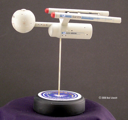 ^ The main parts required little clean-up Image: Lovely boxart Image: Instruction sheet Image: Nacelle alignment sheet Image: Decals were clear and crisp Image: Color decal placement guide Image: Clean castings ^ Smile! ^ View from the rear. Note the nacelle alignment Image: Base with custom decal Image: Right side ^ UES Horizon |