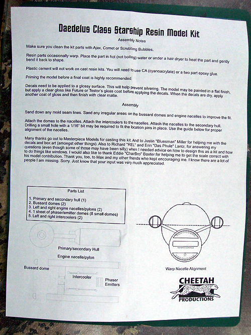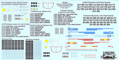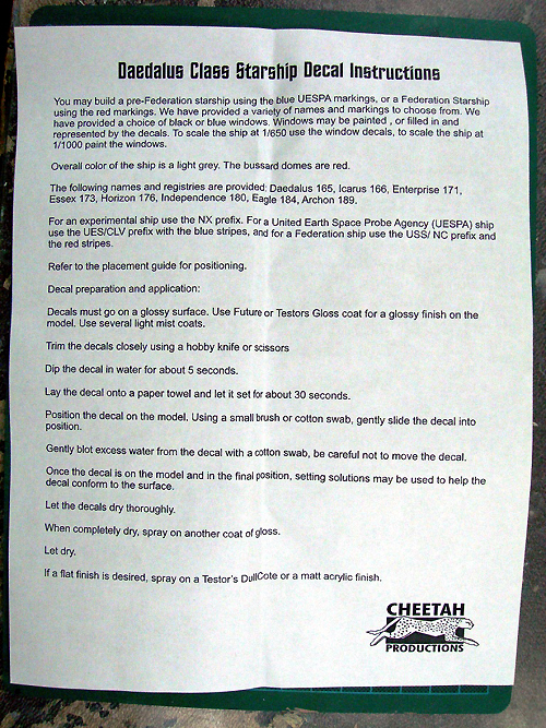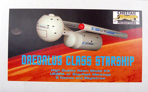After priming and sanding, I gave it a light coat of gloss white. Initially I was planning on putting raised rings on the nacelles, dorsal and secondary hull, but I decided to paint them instead. I pre-shaded the panel lines according to the Daedalus diagrams found online with flat black and after a couple of coat of light ghost grey, I was finished! The decals went down extremely well on the nacelles and secondary hull, but the cargo doors on the primary hull didn't align with the curve of the sphere and gives it a slight “smile”. Cheetah Productions is aware of the issue and looking into modifying the decal. I attached the model to a circular base I had lying around. I printed out an UESPA image and placed it on the base. A couple of coats of clear and I was done! ![]() Conclusions Overall, I'm extremely satisfied with this model. It's obvious that Cheetah Productions put a lot of thought into this kit and it shows in the results. With all the options and possibilities this kit offers, you may have to get several to fill out your fleet! Many thanks to Cheetah Productions for providing the review sample. Manufacturers and retailers, interested in getting your wares reviewed and publicized on a site averaging 3500+ readers a day? Contact us! |