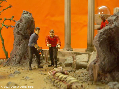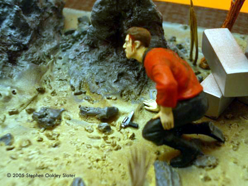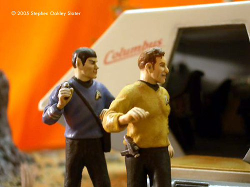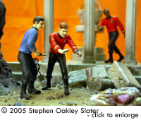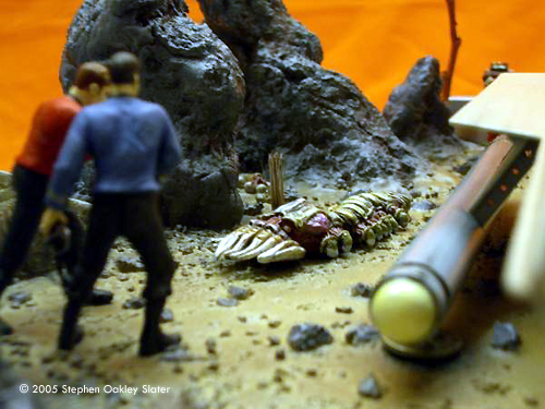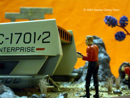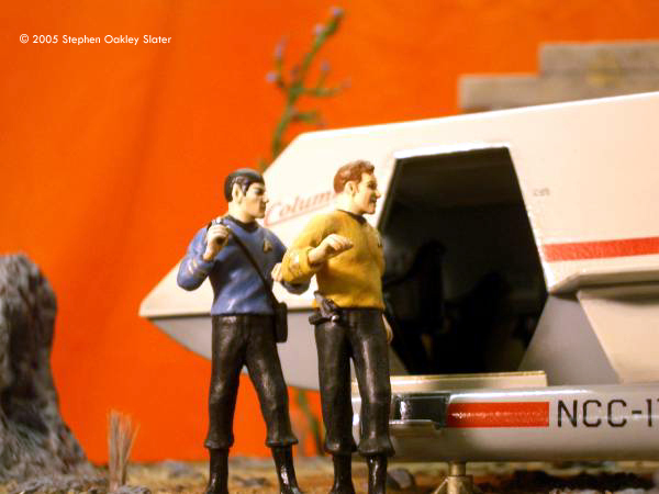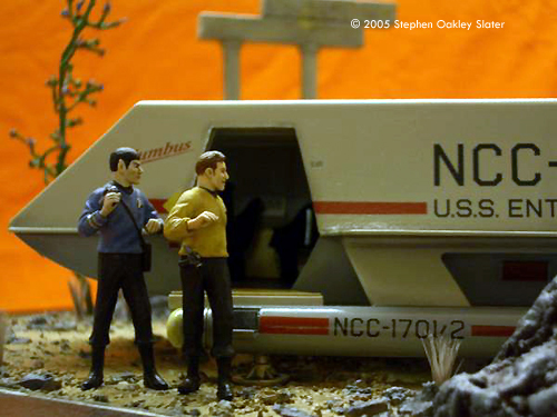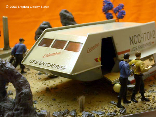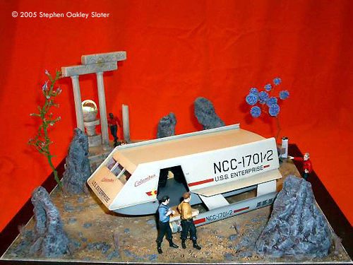 ^ Re-worked shuttle Image: Front view Image: Through the open door Image: Right/front view Image: Right/rear view ^ The mother-of-pearl sheet gives a nice effect Image: Interior, from above Image: Looking through the front windows Image: Rear nacelle cap detail Image: Strut detail ^ Command crew, at the ready Image: Another look Image: Kirk's phaser ^ Alien monster threatens the landing party Image: Captain - over here! Image: This figure bridges the action between both sides of the shuttle Image: Facing Kirk, pointing to trouble ^ Monster or fallen sapient? Image: Red shirt down Image: Closer look at the monster Image: Look out, Ned - he's coming right at you! Image: Another redshirt runs to help ^ Action on both sides Image: Rock formations and vegetation in the style of the original series sets frame the scene. |