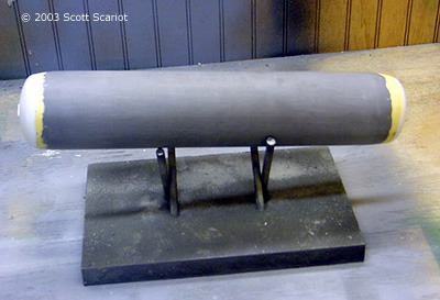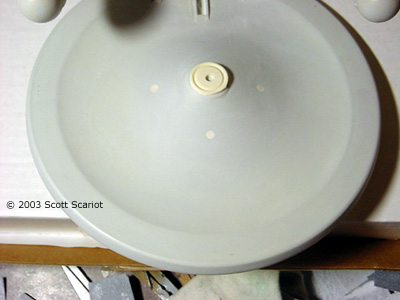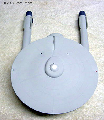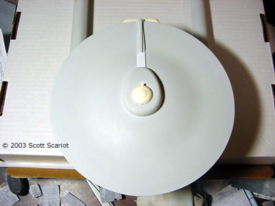 I ran into a problem at this point. There are no bottom views of this ship available. I turned to the Starship Modeler Discussion forum where I got a lot of great advice. Andy Henshaw sent me some great views of the bottom of a project he is working on, as well as some views of the shuttle bays. I measured out the placement of the Pylons on the bottom of the ship and drilled holes into the bottom of the Saucer for the Pylons. I tested the fit and they worked pretty well. I did not glue the Nacelles to the hull yet. I glued the two halves of the Saucer together. Once the glue set, I filled the seam that ran around the edge. I bought an accurate Impulse Deck to replace the inaccurate one that came with the kit. I had some problems getting this part flush with the ship. It took some sanding and a lot of putty to get the part flush. With the Impulse Deck in place, I sanded down all the seams on the saucer. With assembly of the saucer complete, I glued the right Warp Pylon and nacelle into the Saucer with CA glue. I then sprayed on a little accelerator. Once the glue on the right side had set, I moved on to the left pylon and did the same thing. I was surprised at how the well the two pylons attached to the saucer. There were a few gaps around the attachment point. I poured epoxy into those gaps as filler and to strengthen the joint. I sanded all the seams around the pylons once the putty and epoxy had cured. I glued the Bussard Collectors to the front of the nacelles, and filled and sanded the seams. Then I glued the end caps on to each nacelle. Since the schematics did not show the ridges that came molded on the Ertl end caps I sanded them off.