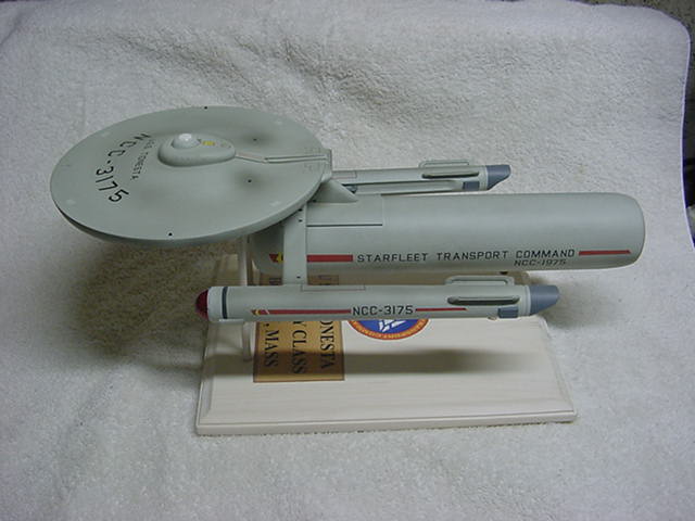 The Tug To prepare the model, I stripped the old paint and decals off using Easy-off. I then scrubbed the model parts and set them aside. During this process, I lost one of the reactor control loops that attach to the inside of the Warp Nacelles. I asked around and several people recommended the resin add-on parts by Accurate Parts available from Federation Models. I ordered just about every part they make. I also ordered Sci-Fi Spaceship Miniatures Cargo Container. Once the resin add-on parts and the Cargo Container arrived, I began construction. First, I sanded the parts lightly to remove any remaining paint. I sanded down the joints to remove the old glue. With the parts now cleaned up, I began to remove the inaccurate kit details. I sanded the raised grid off the top, and sanded the inaccurate details off the bottom of the saucer. Then I cut the four Flux Chillers off the ends of the Nacelles. I cut the old bridge off the kit. I also cut the Dorsal off the Secondary hull. With the Ertl parts modified, I began assembly. I filled the holes on the Warp Nacelles with putty and set them aside. I glued the new bridge into the hole on the top of the saucer. Looking at the picture in the Starfleet Technical Manual (STM) I noticed a raised area on the hull behind decks 2-3 that ran to the detail piece on the rear of the saucer. I cut out a rectangular piece of .04 thousandths sheet styrene and glued it in place. I now began wondering how to make the tow pad. I took some .06 thousandths sheet styrene cut it to size and heated it in my oven. I then molded the plastic over the cargo pod kit. I let the plastic cool a little and then I soaked the piece in cold water so that it would hold the curve. I had to reheat the plastic a few times so that I could get the tow pad shaped correctly. I was surprised that this technique worked so well, and that I did not melt the plastic beyond recognition. I glued the two halves of the dorsal together and glued the tow pad onto the bottom of the dorsal. I filled the seams and set the dorsal aside. The Navigational Deflector was an interesting challenge. There is some conjecture as to the shape of this structure. The STM shows a spire type of structure ending in a globe with the Deflector attached to the globe. I bought a Navigational Deflector and a planetary sensor array from Accurate Parts for the top of the structure, and the dish for the bottom. Now I needed the spire to connect the two parts. I cut a piece of sprue about 1 ½" long and sanded it down into to point. Now I needed the globe for the end of the spire. For this, I bought some beads at a craft store. I glued a bead to the end of the spire. I glued the Navigational Deflector onto the bead. Then I sanded down the planetary sensor array so that there was no dome on it, marked off the center and drilled a hole into it. I attached the thus modified Planetary Sensor Array to the bottom of the saucer. I left the deflector off until after painting. Next, I glued the two halves of the Warp Nacelles together. Filled the seams and set them aside. Once the putty was dry, I sanded down the seams. I glued the new Flux Chillers onto the Nacelles. I also drilled new holes for the Intercooler Units. I glued styrene strips into the Pylons to give them extra strength and support. |