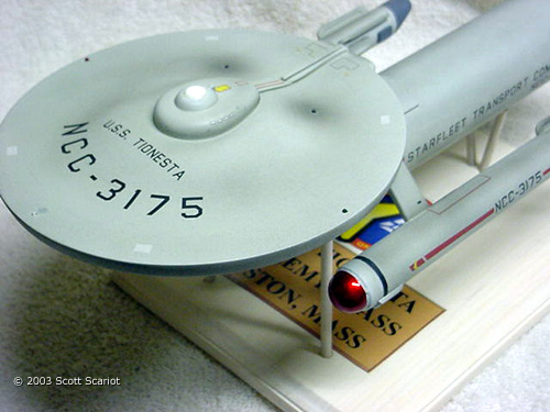 I glued them to the nacelle before I glued the nacelles to the ship. I glued the Flux Constrictors to the underside of each nacelle, starting with the centerpiece and working outward. Then I glued the Reactor control loops onto each nacelle. Finally, I glued the Intercooler Units in place. I filled and sanded all of the seams on the detail parts and the Nacelles were completed. To finish assembly of the Tug I glued the Dorsal and the tow pad onto the bottom of the saucer. Some major seams needed filled. Once the putty had cured, I sanded down the seams. With the Tug complete, I moved onto the Cargo Container. Cargo Container To build my Cargo Container I bought SFSM’s Cargo Container kit. I have built a few of SFSM’s models before and thought that this one would be pretty simple to assemble. I built the kit as a Starliner. I thought the Starliner would make the model a little different. However I ran into so much trouble trying to get the seams filled and hidden that I abandoned the Starliner and decided to build a standard Cargo Container. I used a piece of 2 inch PVC piping, to make the body of the container. I used the two Cargo Container end caps that came with SFSM’s kit, and glued them onto the pipe and filled the gaps with putty. After it set I sanded it down. I had the Cargo Container built in two days. Painting Painting began on both the Tug and the Cargo Container with a coat of primer. The primer showed some areas on the Cargo Container that still needed attention. These were mostly minor seams around the end caps. I filled these and sanded them down. The Tug was airbrushed with three coats of Light Gray. I painted the Nacelle end caps, Flux Chillers and Reactor Control Loops Gray. I painted the bubbles on the end caps and the bridge dome White. The Intercooler units were painted Light Gull Gray. The Impulse Engines and Phaser Banks were painted Gunmetal. The trough in between the Bussard Collectors and the nacelle was painted Black. The Navigational Deflector was painted with a metallic Brass. For the Bussard Collectors I tried a different technique that was recommended to me by a friend. I painted each Bussard Collector silver. Then I painted thinned Tamiya clear red over the silver, building up the color slowly. This gave each Bussard Collector some depth, it also made the Collectors appear as if they were a clear styrene part instead of being opaque. Once the Bussard collectors were painted I glued the Navigational Deflector into place. The Cargo Container was also airbrushed with three coats of Light Gray. The only details on the Container are the attachment points on the bow and the stern. I painted each one Gray. Detailing With the painting done I moved on to detailing the model. I had removed the inaccurate grid that was on the top of the saucer. I drew in a new grid pattern using a pencil, compass and ruler. It took me a few tries to get the grid laid out correctly. I also added a grid to the bottom of the saucer. I also added navigational lights and Phaser Banks with styrene bits. The Navigational Lights were painted red, green and white. I airbrushed a few coat of gloss coat onto the model and set it aside to set. Decals For decals I turned to JTGraphics. The decal sheet retails for $20.00 and includes everything needed to make the model truly accurate. The window decals replace the inaccurate ones molded on the kit. I had the decals customized so I could christen the ship U.S.S. Tionesta, after a town in Northwestern Pa where I spent a lot of time as a kid at my family’s cabin. The decals, as always, went on easily and gave the model the right look I think. I gave the decals a day to set. After the decals set I airbrushed a few coats of a clear flat coat onto the model. Finishing To finish the model I glued the Cargo Container onto the tow pad and the Navigational Deflector onto the bottom of the saucer. I airbrushed a few light coats of Euro 1 Gray onto the model to dirty it up a bit. I don’t think these ships were maintained in pristine condition. I made a stand for the model out of a wooden plaque and dowel rods. I made a custom dedication plaque, and found a Starfleet Transport Command logo on-line I laminated both of these and attached them to the base. I then applied two coats of polyurethane to the base. I started this project thinking that it would be a cheap alternative to buying a new kit. Boy, was I wrong. All totaled, the project cost me about $77.00. Most of that cost was in the Cargo Container kit and the decal sheet. I started the project in late September and it took me about five months to complete. The project was challenging but enjoyable. I am extremely happy with the way the model turned out, because this was my first major kitbash project. With Polar Lights’ new Constitution Class kit on the way I’m sure it won’t be my last. Paints Used