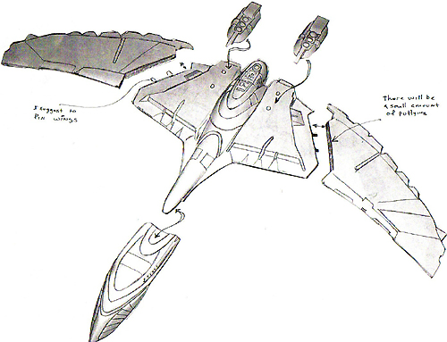 Shortly thereafter Nova Hobbies released their 1/1400 Negh'Var. Last but not least Ravenstar Studios brought us their 1/1400 Valdore. I really wanted a Valdore. I thought the ship was one of the better designs from Nemesis but after having bought Starcrafts Jem'Hadar Battlecruiser I had to do some gentle arm-twisting before I convince my wife to let me buy Ravenstar's Valdore. The model consists of 29 resin parts. The parts arrived wrapped in bubble wrap. All of the parts are solid cast. The largest parts of the kit are the main body and the wings. When fully assembled the model has a 27” wingspan! The kit is well cast. I was unable to find any holes, or bubbles, and there was absolutely no flash. While examining the warp nacelles I noticed that the edges are a little soft. The wings however, are covered with a very crisp feather pattern. The details on the rest of the model are good. Some of the windows are a little crooked. A quick test fit of the model shows the parts fit very well. The four-page instruction guide explains assembly and is easy to follow. It also recommends areas were pinning the model might be needed. Assembly looks to be pretty straightforward. Several parts fit overtop of seams so filling will be cut down. The only area that appears that may cause an issue is where the warp nacelles meet the wings. This will need to be epoxied and pinned. There is no paint guide, however I don't think one is needed: Romulan ships are green, just green. |
