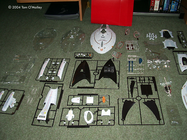 | ^ Rear view Image: Box Image: What you get Image: Top view Image: Under the saucer Image: Left/rear view, nacelles up Image: Landed Image: Gawker's view Image: Underneath the engineering hull Image: Under the fantail ^ Aft hull lit up Image: Saucer lights ^ Main lights Image: Nacelle wiring ^ Compared with Bandai's Enterprise-E kit Image: With the Revell-Monogram models Image: With the Playmates version Image: With the fleet ^ Bye-bye, Voyager... |