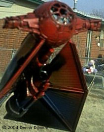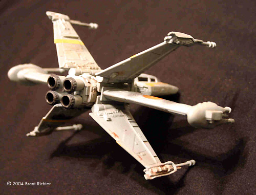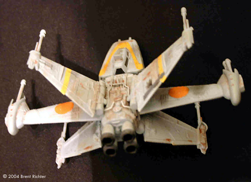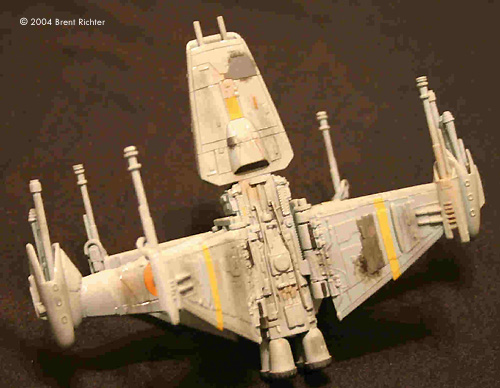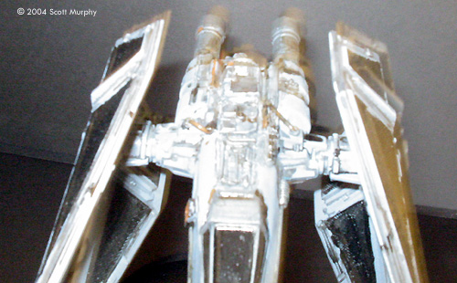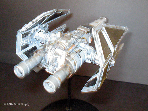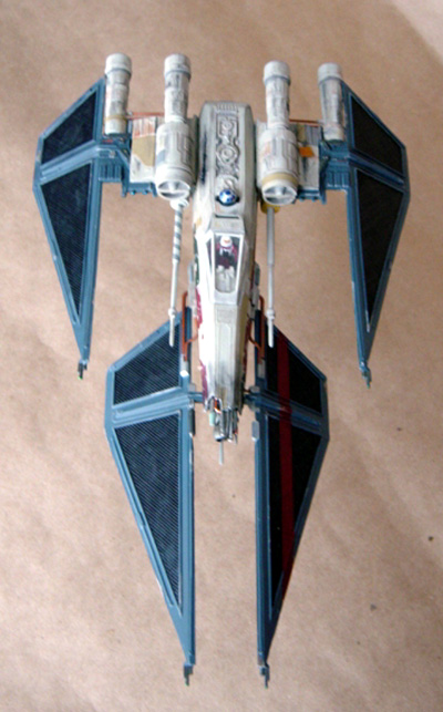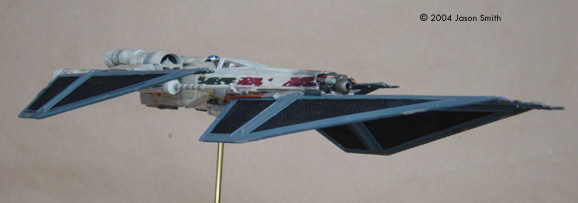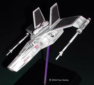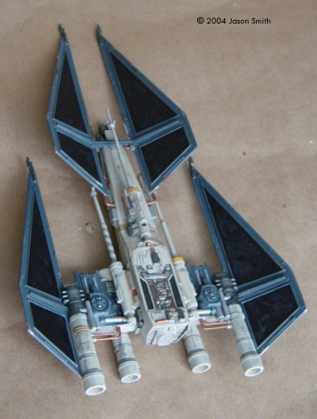 X-ceptor Ugly by Jason Smith Scale: Approximately 1/72 The Empire drove many kinds of people to become pirates. Among them were the occasional engineer or designer. The 'Asylum Raiders' were one of the lucky pirate groups to take in such an engineer/designer. When it came to piecing together an Ugly from the heaps pirate’s scavenged wrecks, he was almost booted out airlock for taking twice as long as the other mechanics. But then he unveiled his creation. Suddenly the leader of the pirate’s had found himself a new fighter. Apparently this design has become quite popular, as this ship has been stolen and recovered 7 times. In order to create more of these unique fighters, plunder bonuses are the bounty for any of the pirate’s star jockeys that can blow out an Interceptors cockpit and leave the wings, more or less, intact. The Ugly sports six laser cannons; four from the Interceptors, and two from the X-wing. A third X-wing cannon, converted to and ion cannon, is slung beneath the cockpit. This fighter boasts a personal trophy from one of the leader’s kills, a solar panel from one of the Empire’s elite 181st squadron. I designed this ship back in September, but due to waiting on the kits I needed to build it, I actually didn't start cutting on it until 12/26/03. The kit was created from the Ertl snap X-wing and Interceptor kit. All of the added detail was from bits of styrene. The entire kit was painted with Tamiya and Testors paints and weathered using a variety of washes and pastels. |