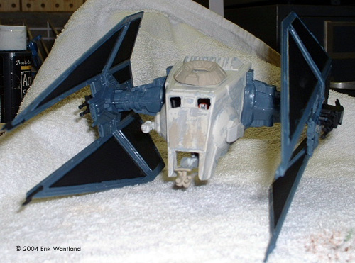 Unlucky, right. That planet served as a junk yard by Koensayr before being abandoned during the Rebellion. Of course, it had been picked bare of all the Y-wing components , I was still able to cobble together enough parts to build a new engine, add a hyper drive and shield generators, upgrade the power couplings and augment the weapons. I couldn't find any strike foils or lifting surfaces to replace the solar panels, so I had to make do with the one I had left. Putting all that together in one package wasn't easy, or very practical, but I did it. After all I started out as an engineering student. Not sure what to call my re-built fighter, other than Ugly. Okay, stating the obvious, I used ERTL's T.I.E. fighter for this little beastie. I scrounged my parts bin and pulled out a few goodies to slap on her. The long fuselage started life as a jet fighter, don't remember what type. The canon looking thing underneath started out as a gun from 12” figures. I cut the cockpit off the fighter, just behind were the seat was, cut off everything, filled in the gaps. Gutted the electronics from the gun and glued it under the fuselage. The T.I.E. ball went together pretty much OOTB, I just left out the “glass” and back hatch. Then I slapped it onto the front of the fuselage, were the cockpit was. Next I split a solar panel in two, diagonally. I stuck them were it made the most sense. I added brass and aluminum tubing to the spaces were the solar panels would have been, and some coming out of the T.I.E. itself. To give it final touch of ugliness, I painted it red, yellow, blue and black. That is Ugly! |