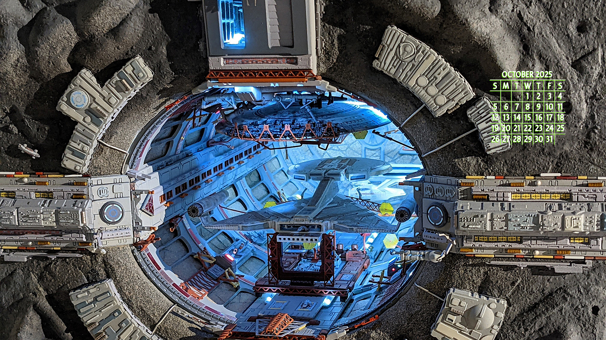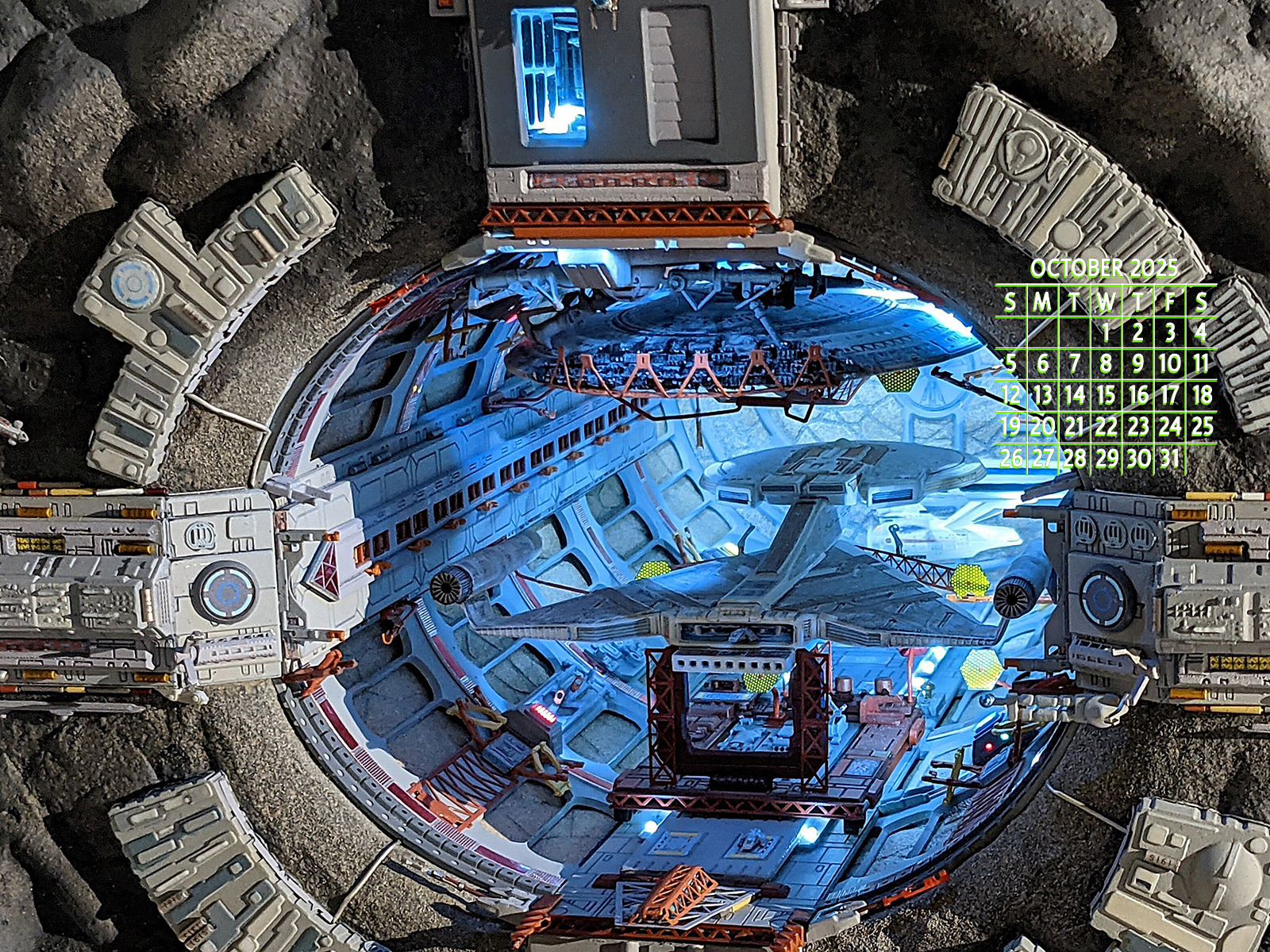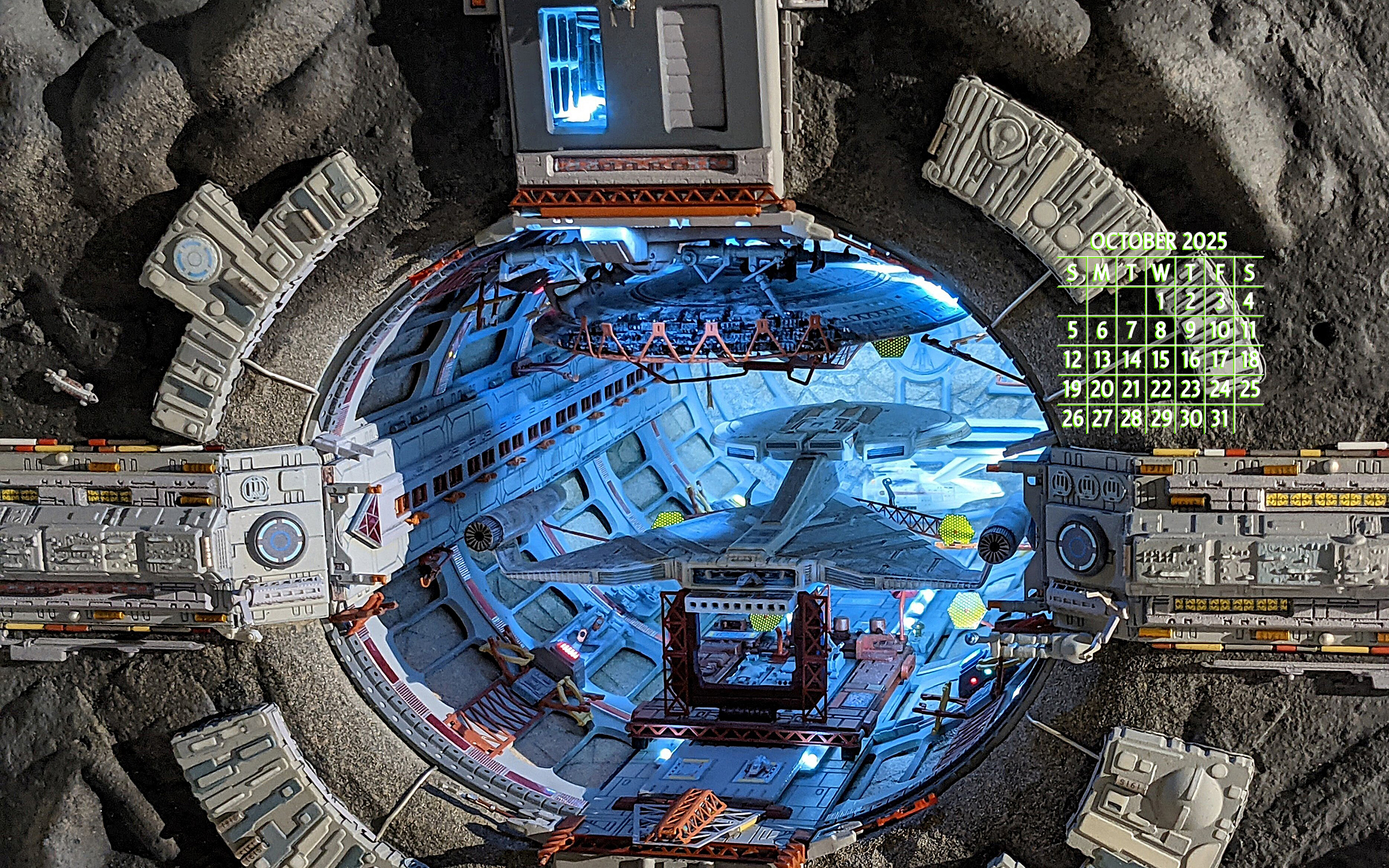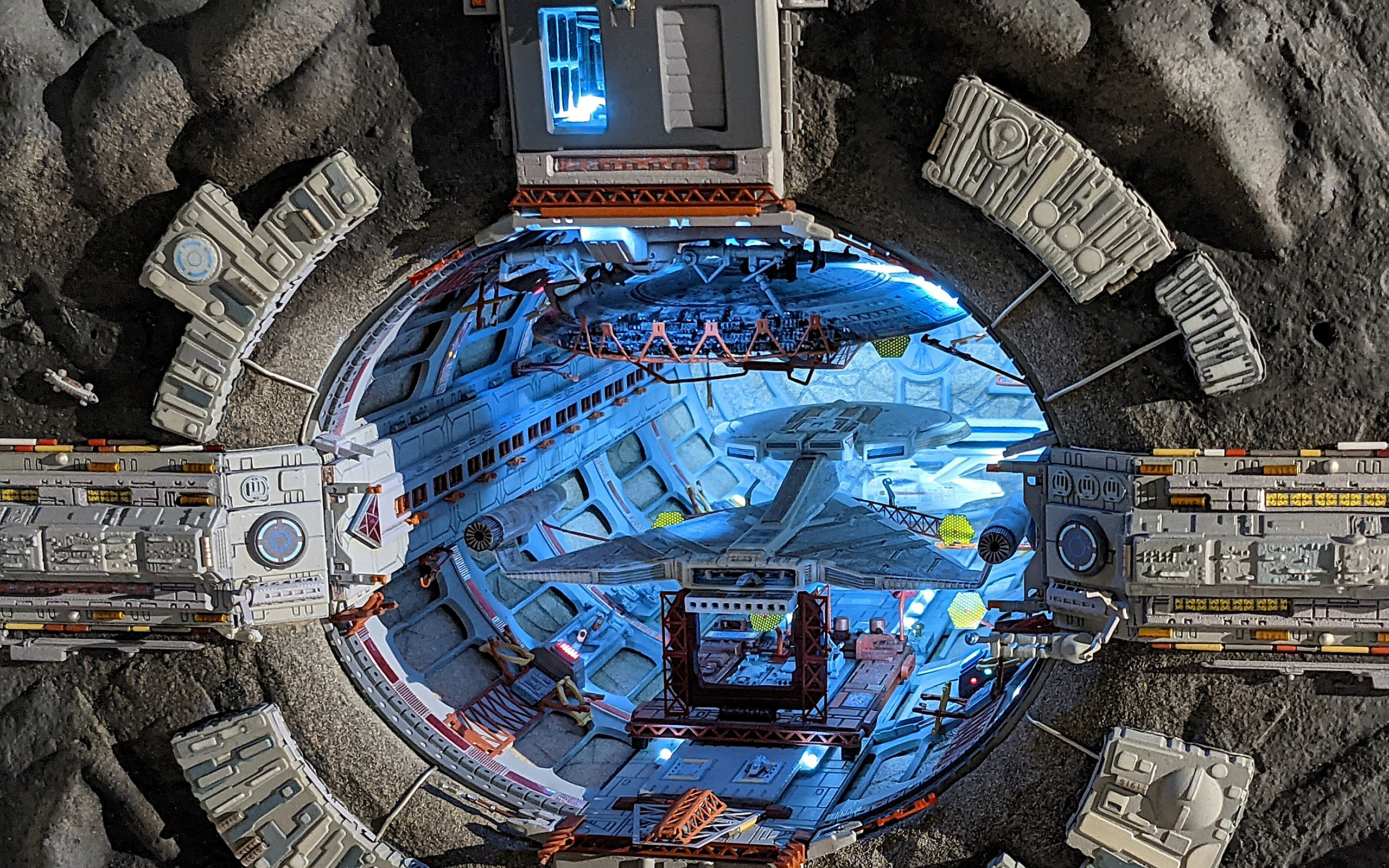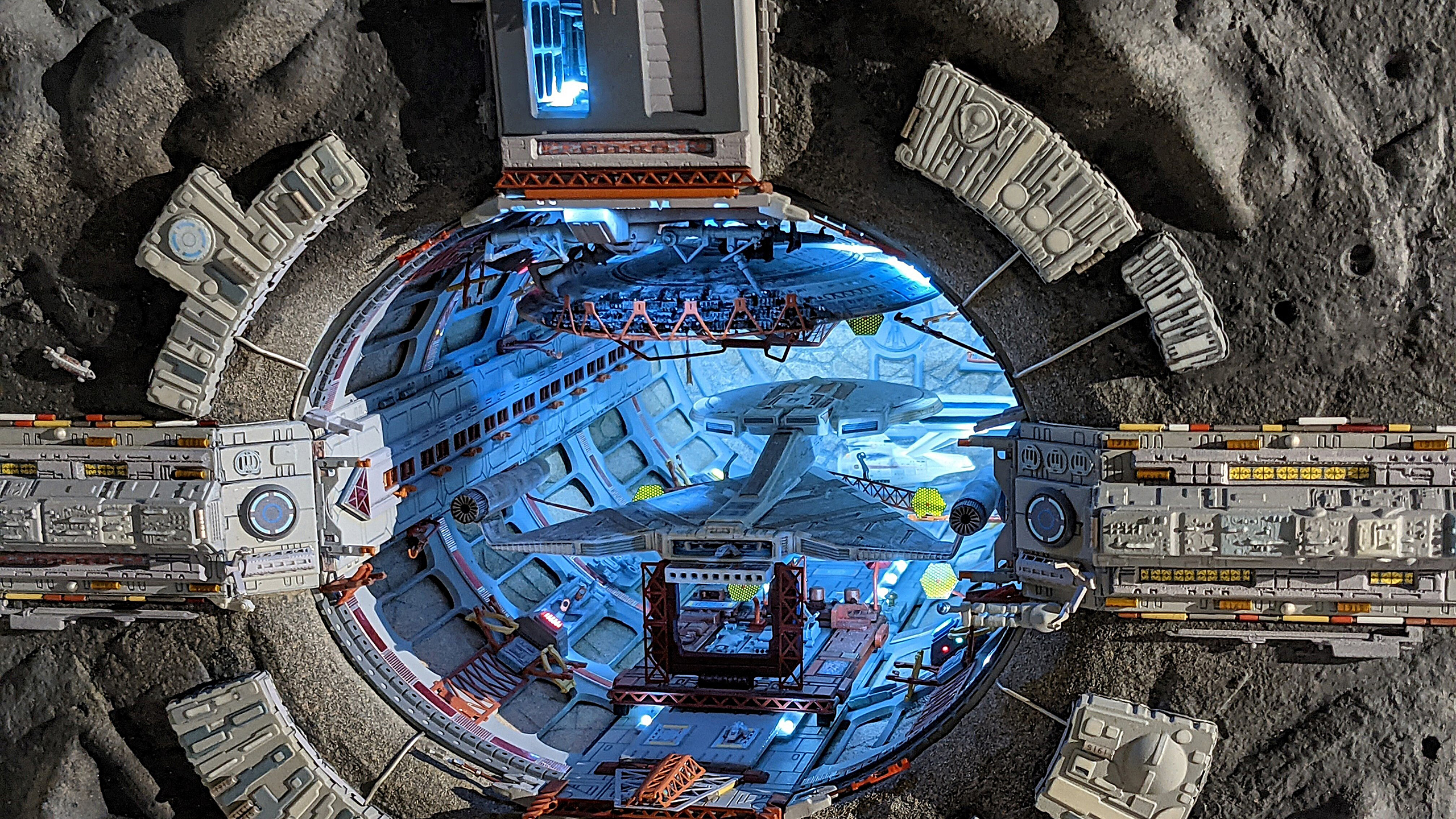 Octomber 2025. Asteroid Dock by Mike Walston. Mike says " I kitbashed Polar Lights' Discovery and AMT's Enterprise-B kits to make a 1/2500 scale "McQuarrie-prise." Engines are made from plastic tubing. Kit decals were modified on CorelDraw. The docking pallet is made from engraved plastic stock and a painted circuit board. I cut off the Enterprise-E bow and used 1/16" plastic shavings to depict collision damage. Runabouts inside the dock are from the DS9 kit. For the Asteroid Dock, I cut a hole in a 13 x 10.5 inch plaque, and used 1/32" plastic stock for the rock interior, with 1/16" stock for the interior supports and supply bays. Details were cut on a CNC router with patterns designed on CorelDraw and DesignCad. The surface was detailed with parts from an Alpha Moonbase kit. Additional scaffolding came from Metal Earth kits."