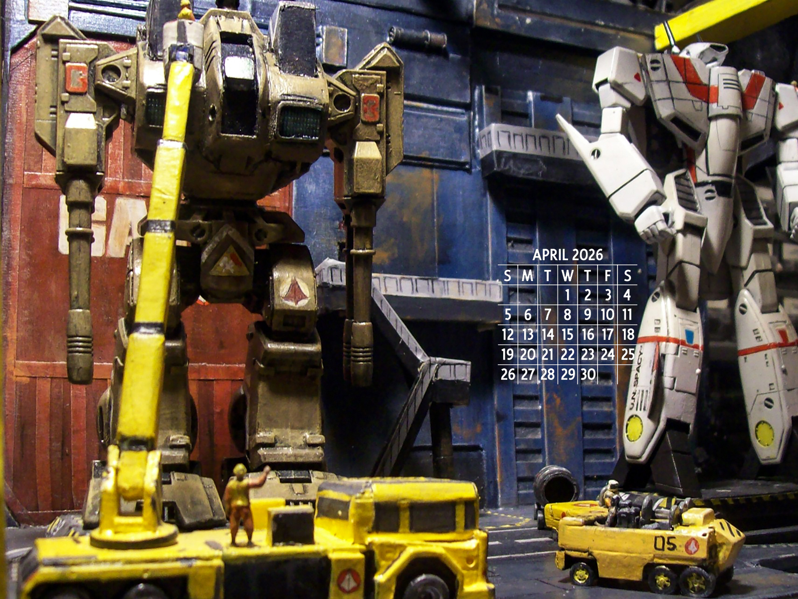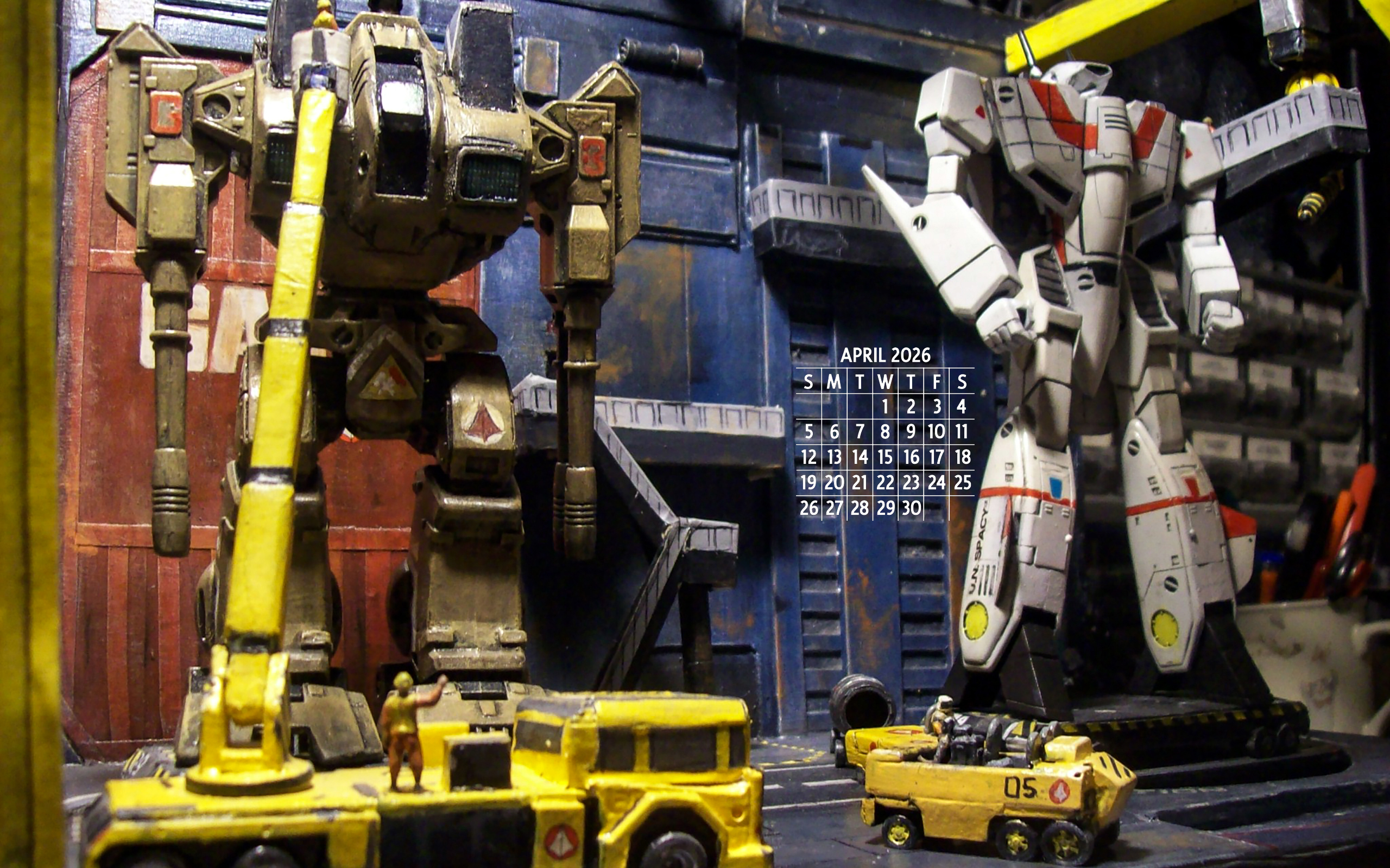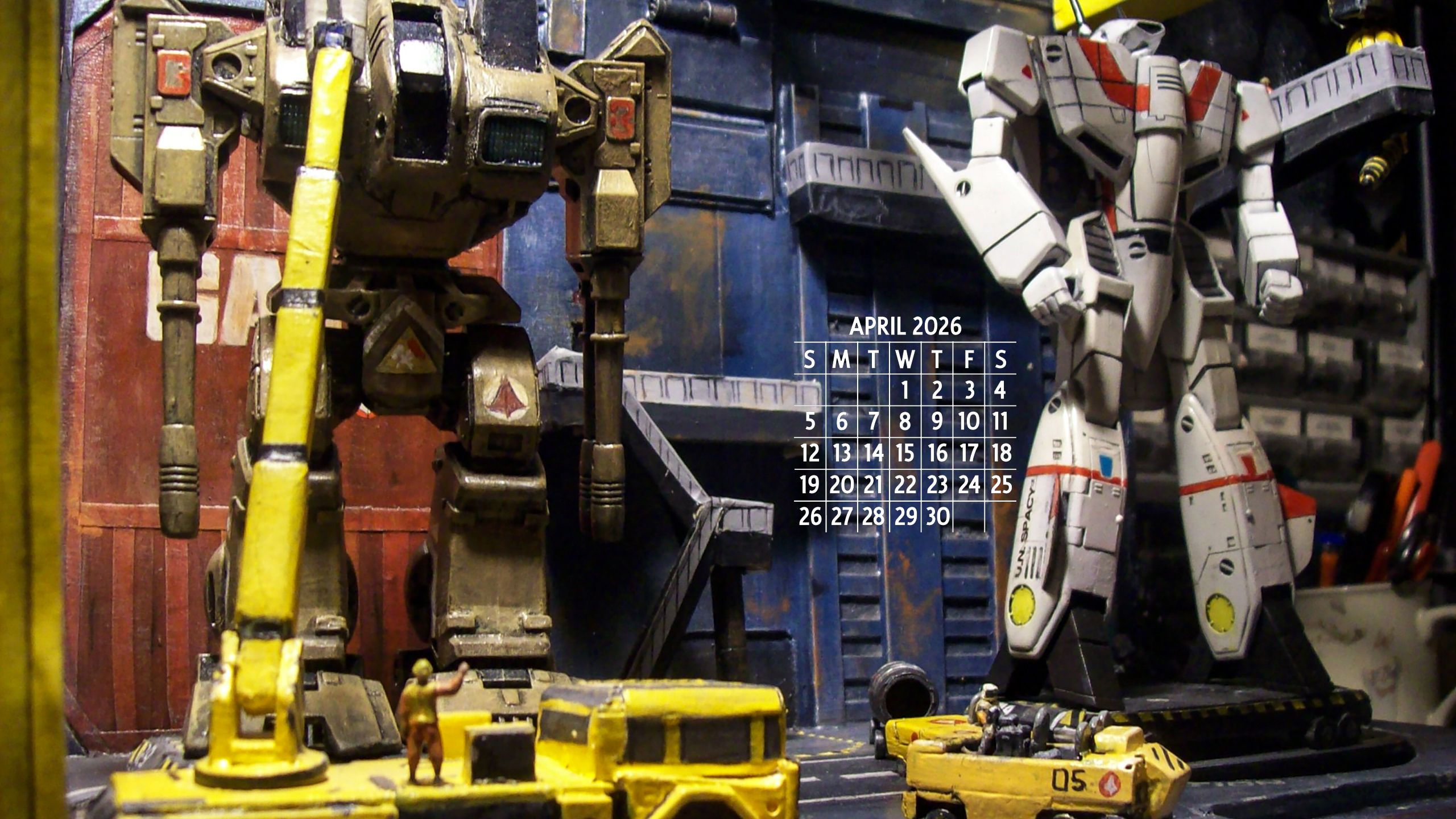 April 2026. Robert Stimpson's scratch-built 1/72 Macross Armored Factory, built from matboard, styrene and masking tape. The Destroid is a Playmates reissue of a Matchbox Robotech 1/72 "Raidar X" (Macross ADR-04-Mk X in reality) that was tweaked and repainted, while the VF-1J Valkyrie is an Imai VF-1 transformable kit that has been customized into Hikaru Ichijo's (Rick Hunter in Robotech) colors. The vehicles were all scratchbuilt, while the 1/72 figures (painted as Macross personnel) are from Italeri's 1/72 NATO Flight Crew kit.
