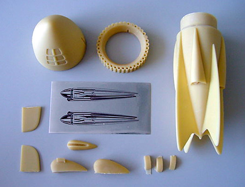 Herb Deeks Model's first kit neatly captures the lines of a typical rocket ship from this era.NOTE I've read that it's "one of the best resin sci-fi kits of all time"; I don't necessarily agree with that assessment, but it is a good kit with retro appeal. What You Get Inside the box are 11 resin pieces, one set of instructions, and a silver card (sticker?) with stylized rocketship prints. Packaging was good, and no parts were broken. The resin is some of the smelliest I've encountered. Even after airing out for three weeks, handling the parts for any length of time can bring tears to one's eyes. Not sure what it is, but the resulting casts are smook and completely free of pits and bubbles. The molds for my particular kit appear to be nearing the end of their useful life - excess resin has bled into some of the holes and undercuts, where bits of the mold rubber have crumbled. For the majority of the parts, cleanup should merely be a matter of some light sanding and shaping. However, the "collar" that sits behind the "cockpit" module will need to have several holes drilled in the exhaust pipes to remove excess resin. The four exhausts further back on the main body will be a bit tougher to fix, as the excess resin is in difficult spots. The instructions are sufficient to guide all but the most novice modeler in assembling the kit. It helps that parts fit is pretty much self explanatory. There are no decals - which is just as well. Most of the period rocketships had no markings anyway. Assembly and Finish Assembling this model should pose no real problems. I am going to replace the door engraved on the port side of the hull - the engraving is too deep, and crooked to boot. I'll fill in the engraved lines, sand everything smooth, and laminate a thin sheet of styrene on in it's place. Fixing the exhausts further back will be a bit of a challenge. Knowing my skill with the dremel (or lack thereof) I may just fill the cutouts with putty and use styrene sheet to extend the exhaust walls further. I have not decided if I'll add the rivet heads often seen on these ships. Most every rocketship from this timeframe was silver - representing bare metal of some sort. The kit parts are generally smooth enough that a metallic finish is feasible. Since metallics magnify every scratch and every flaw, a good primer and diligent polishing will be required before laying down the final coats of paint. |