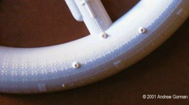The design is loosely based on Werner Von Braun's design that appeared in the classic Collier's Magazine articles and Across the Space Frontier. The entire station rotates to provide a simulation of gravity (like a space station should), and power is provided by a pre-photo-voltaic steam turbine system. Trough-shaped mirrors on the top of the station would focus the suns on mercury-filled tubes, boiling the mercury to run turbine generators! Temperature / solar gain would be regulated by black and white shutter devices that are molded into the outer surface of the kit ring. What You GetThe Lindberg kit comes in a sturdy box with dynamite artwork of the station under construction. Its 70 parts are molded in mainly white plastic, with lots of old fashioned rivet detail. The main ring, arms and hub are molded in a top and bottom half, 9 inches/23 cm in diameter. The ring itself is 1"/ 25mm thick. The solar collector trough comes in four separate pieces that are not designed to meet at the ends, probably to make alignment easier for sticky little fingers. The mercury tube is molded integral with the trough, and does not connect to the station's hull. There are two nicely detailed 1 1/2" long "Space Cars" (4 parts each) that press-fit into the station's landing platform, interesting looking heat exchangers, supports, communications antennae, storage tanks, and communications arrays. There are also two rivet-encrusted, teardrop-shaped spin motors. The overall effect is busy, but functional. A scan of the instruction sheet has been on the web for a while at: http://www.greysteele.com/models/starprobe.htm. The site owner graciously gave permission for this link to be used. Be sure to check out the other old kits at the site while you are there. Peculiarities This kit was first issued in the late 1950's, and it shows. Fit is really not bad at all, but you will need to do some filling and sanding. Lindberg included a lot of surface detail, which in the 50's meant RIVETS! Thousands of them, each one scaling out to the size of your head. Personally, I like them, but they can always be sanded off. The plating they are there to represent is the "meteor bumper", a second skin around the entire station to protect it from impacts. An attempt is made at moving parts, with each of the space cars a press fit into a whopping 3/16" / 5mm hole in the landing platform. I'll probably just pretend the mounting rod is an airlock and leave this be. |