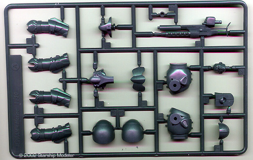 Construction starts with the arms. Simple, standard construction, no elbow joints, a pivot for the shoulder, and the hands are held in place by friction and a Teeeny little ridge. The styrene is slightly (VERY slightly) flexible but does NOT take the place of discrete polycaps or O rings. Legs are next (surprise!) with limited articulation. (NOW I see why all those kits have articulated ankles. So they can stand up. This one doesn’t, easily.) The knees flex, and are well designed to keep glue off the joint, and the hip has a nifty ball joint for excellent posability. Unfortunately, from the back, the ball is very visible - a human can’t fit into this suit. The torso goes together well, with a waist joint, and a mud flap (butt protector), but the codpiece (horn like sticky up thing) in the front can interfere with the chest plate. Either do some trimming so the chest plate fits very snug, or do some carving on the back of the horn so that it doesn’t scrape off paint from the chest plate. The legs and arms slip onto the body via rods. Rods come from the shoulders into the body, rods come from the hip joints into the legs. No O rings. No poly caps. These joint will ‘wear out’ quickly. One of them was already a bit weak after the first ‘fitting’ session. The arms and legs do articulate well. Lots of motion, and the legs can pivot out and in a bit for balance. From the front and sides, the figure looks fine. From the back you can see too much of the ‘workings’ for good all around photo use. The head can be handled in several ways. Although it looks very hunched in place, you can use a half helmet with a full head, or a full helmet only. I was (and still am) tempted to rebuild the helmet so it stands higher, letting the occupant actually have a neck rather then have the appearance of his head growing directly out of his chest. I painted this SpaM with a mix of ‘oily black’ and ‘stainless steel’ Pollyscale paints - yes, mixed together for a ‘sparkley grey’ finish. Better than straight ‘gunmetal’. The accent areas were painted with a brick red, rather than bright anything. The faceplate of the helmet was done in gloss black. “Wear areas” and ‘dings’ were picked out in Testors solvent based chrome. And all the painting was done with a brush - no streaks, no lumps, no missed areas. Looks airbrushed. I Love Pollyscale. Conclusion All in all, these were quick fun models. Not too complicated. Nicely detailed. Imaginative. Chewy, with a delightful flavor of.... (No, wait. That was lunch.) A set of ‘medical’ figures has been announced - apparently women in power armor. Good choice. M*A*S*H in Space. Wonder what the next figures will be? More Zerg? Some Protoss? And what’s a ‘FireBat’? Many thanks to Zog's wallet for providing the review sample. Manufacturers and retailers, interested in getting your wares reviewed and publicized on a site averaging 2000+ readers a day? Contact us! |