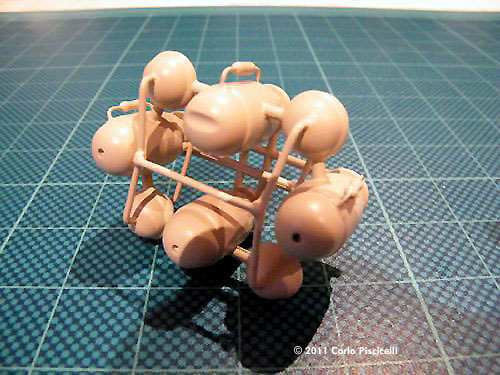 I did however decide to build a different Eagle to the one I had. I chose to build an Eagle Passenger Transporter and to do this on a budget. I scrounged and scratch built all the additional parts I needed to complete this model as I do not believe that to build a good model you must always have to buy expensive accessories.I used every day items, which I am sure you can easily obtain or have lying around your home or workshop. I had fun doing this and at the end of the day I think it worked out well. So here's how I went about accurising and finishing my Eagle Passenger Transporter. Getting Started To begin with you need to drill out the space between the girders of the engineering and service module. This is tedious and care is needed to ensure that you do not damage any of the support girders. Drill out the windows, side end doors and side panels on the passenger pod and clean them up. Then using a Dremel tool remove as much of the inner plastic as you can within each window and finish off using a scalpel blade and several small files to clean up the corners and edges. Do not be tempted to rush this as the windows stand out on the finished model and as such any imperfections will ruin the overall appearance of the completed model. Alternatively, a picture or photo of the interior of the craft placed inside of the pod to simulate the interior with lighting could be inserted if you really wanted to and were keen enough to do so. However, my simple technique proved to provide a subtle nice effect. After measuring the internal length and height of each pod I cut out four square pieces to be used as the internal bulkheads. I used a sheet of 1mm thick plastic card to do this. On the outside face of the plastic card walls between the girders I added some odds and ends from my spares box to build the ducting system. They look complex and functional, just the right mix for this model. The systems were then all sprayed with a gloss Tamiya Neutral Grey and left aside for a few days to dry. Plumbing The next step was to enhance and detail the engine array, which was going to be a challenge; many images were down loaded from the net, which I had to compare and study in order to undertake this part of the project. Reference material is always essential when undertaking such a modeling project such as this. Using 2mm thick copper wire and some very old resistors from an unused antique radio, I constructed the pipework and extra fuel pods for the main fuel tanks. Drilling the little balls I added the pipe work followed by the resistors, which were superglued to the main tanks. If you don't have any old resistors handy, you could cut and shape the part using a piece of thick plastic rods from old kit sprue. Then using a thin drill bit, I drilled to allow a thin copper wire to be inserted through this. Everything was then sprayed using Tamiya Light Grey overall and left to dry. As you can see from the image the result was a great improvement on what was before. Landing Gear While the main fuel tanks were drying I then focused once more on the landing pods and landing gear. I must stress that the landing gear provided in the kit is an absolute shocker. To begin with the landing pods and gear look wrong and under scale compared to the size of the model they are supposed to support. As a result, they do need to be enhanced big time and again, my spares box came to my aid in the form of a set of 1/144 scale Boeing 747 Jumbo landing gear. Cutting 2 mm from the top of the landing strut I then removed the wheel connections. This worked a treat as it ended being the right height for the Eagle. After cleaning these parts and sanding then down, I then sprayed them with Tamiya light Gun-Metal colour. The result was perfect! The landing pads were next, so I removed the center-landing pin and sanded this as close as possible to the base. Care and attention to detail was required to ensure I did not ruin the landing pad. This process was repeated for the other three landing pads. I sprayed them all with the same colour as the landing gear and let them dry for a couple of hours. After which I proceeded to glue the landing gear to the pads. What a pain this was to get them straight! I ended up having to actually melt the two ends together with DCM liquid glue (i.e. Dichloromethane Glue). It looks pretty realistic to me and once the silver parts were painted in, that's some handsome landing gear. The next step was to drill out the landing pods in order to fit the landing gear in place. The center of the pod was drilled out with a 6mm drill bit. The sides were then filed down in the middle of the hole to about 2mm depth using a 2mm file. A sheet of plastic card was then cut to size and shape to enable it to fit in the middle of the pod. This was then glued into place. Once the landing gear was glued into place, I felt that the whole assembly needed a little something extra. So I decided to add struts between the landing gear strut and bottom of the pod. I cut 5mm lengths of 2mm copper wire, which were then super glued into place. Not bad even if I do say so myself. Front Office You do not need to do much to the Eagle's nose cone apart from painting in the window frames and spraying a very light coating of Tamiya light grey. This is a form of shading to simulate the paneling in certain areas. Black "dots" strategically placed on different panels help to simulate the locking devices that were on the actual TV show models and provides a subtle overall effect to the nose. Engine Assembly The engine bells were next. To these I made up some four flutes which go inside of each bell. These were cut slightly smaller in circumference to the engine bells using an 18mm borer. A 4mm center hole was then drilled out and an additional four 6mm half holes were cut on the outside edge of the flute. Once this was done the disc was then super glued just inside the engine bell. You have to repeat this process 3 more times to the other engi