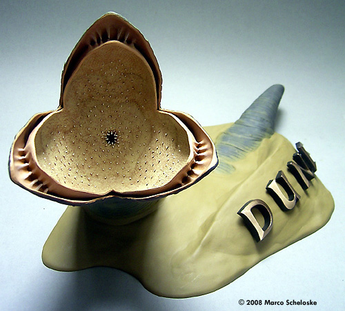 By Marco Scheloske - images & text © 2008 I must not fear. Those lines, taken from the novel DUNE by Frank Herbert, are a perfect match to the old sandworm styrene model kit from Revell from 1984. Easy looking when you open the box you'll soon discover that it looks very, very strange when build as it is supposed to be. You read a review once about that kit, telling that it is crap? That review is right… So what is to do? Put it back in the box, and deep into the storage locker? No! Face your fear! Turn it into something special! That's what I did, and here is the story about how it was done. |