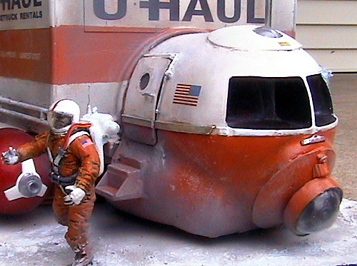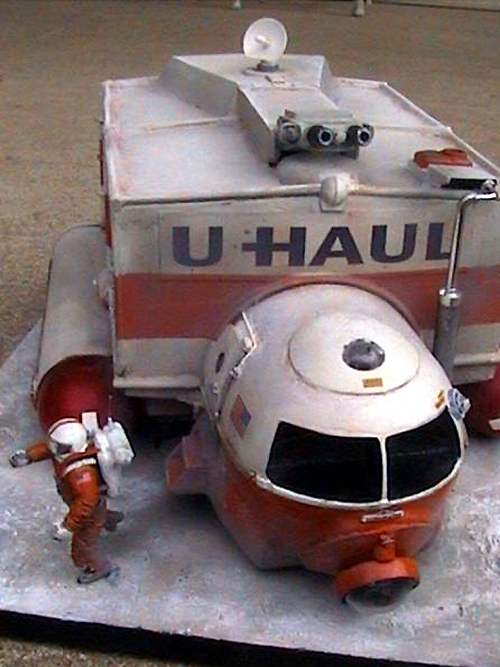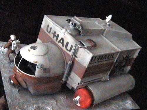 I got the idea for this project from the Colonial Movers ship in Battlestar Galatica. The cargo box is made from two model car display cases. The main engines are paper towel tubes covered in sheet plastic, the docking engine in the back is from an old lighted makeup mirror. There are lights in the engines and cockpit I made the cab from a Revell 1/24 scale Vostok space ship. I added parts from the Revell 1/72 scale space shuttle and my spares box. The dude in the rented space suit is a 1/24 scale astronaut figure from New Ware. The graphics are from the U-Haul web site; I printed them on card stock, cut them out and glued them to the model. Then I sprayed clear flat over them to protect the ink. I was going for an old beat up and covered with moon dust look.