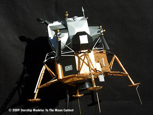 The model is the Monogram 1/48 scale Lunar Excursion Module. I built it out-of-box with the exceptions of mounting in on a support tube over a lunar surface and placing a red LED in the decent stage engine. I ran the wires down the support tube to a 9 volt battery hidden in the lunar base. The gold "Mylar" film from the kit was substituted with the gold foil from chocolate bar wrappers.